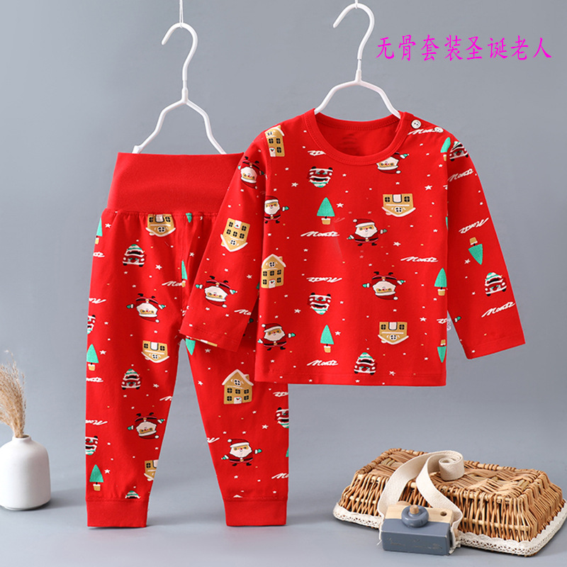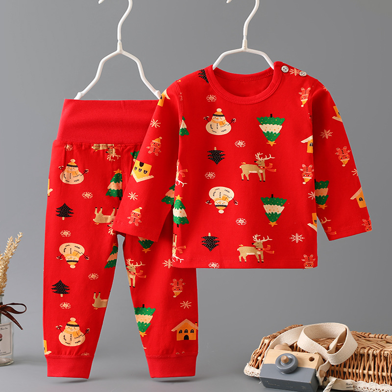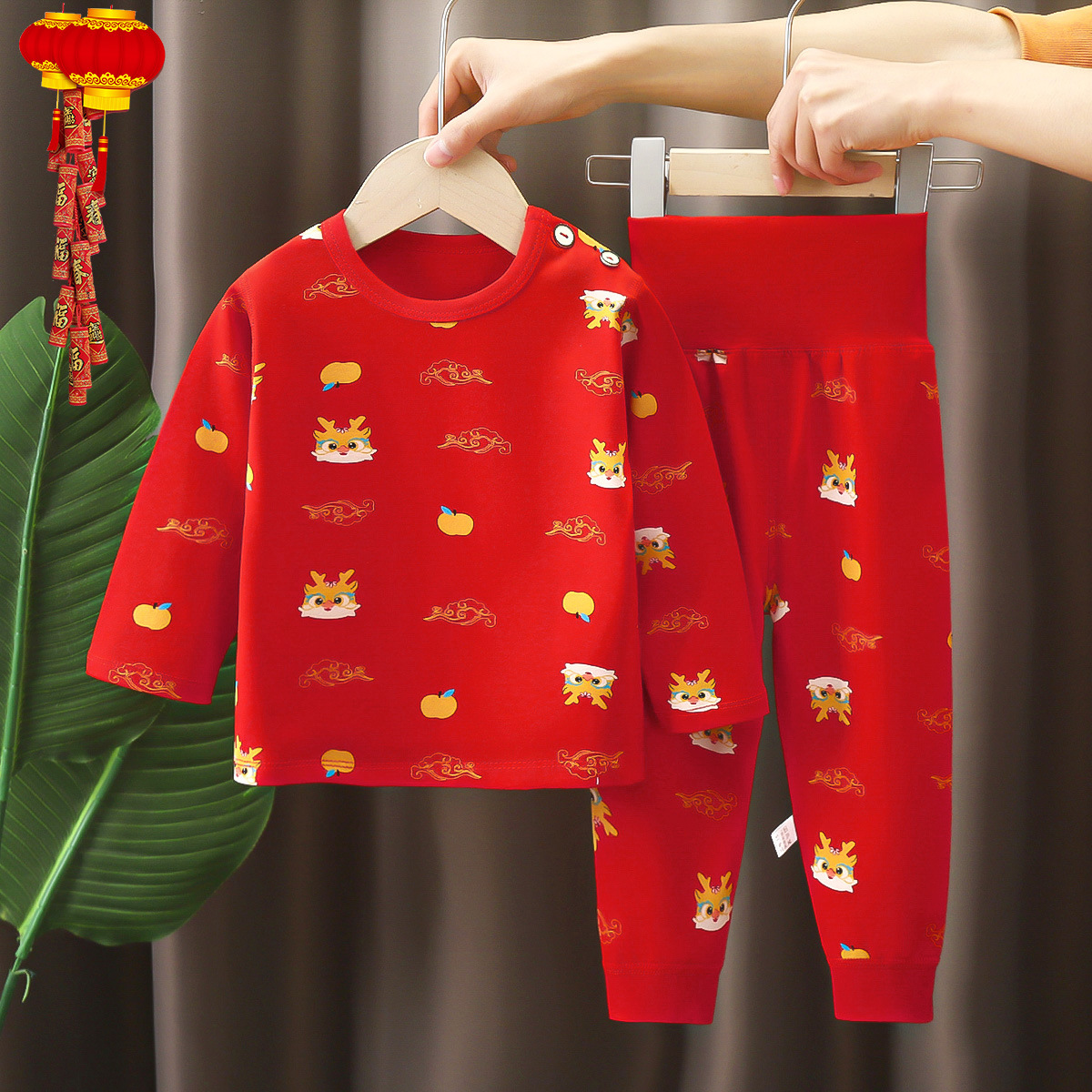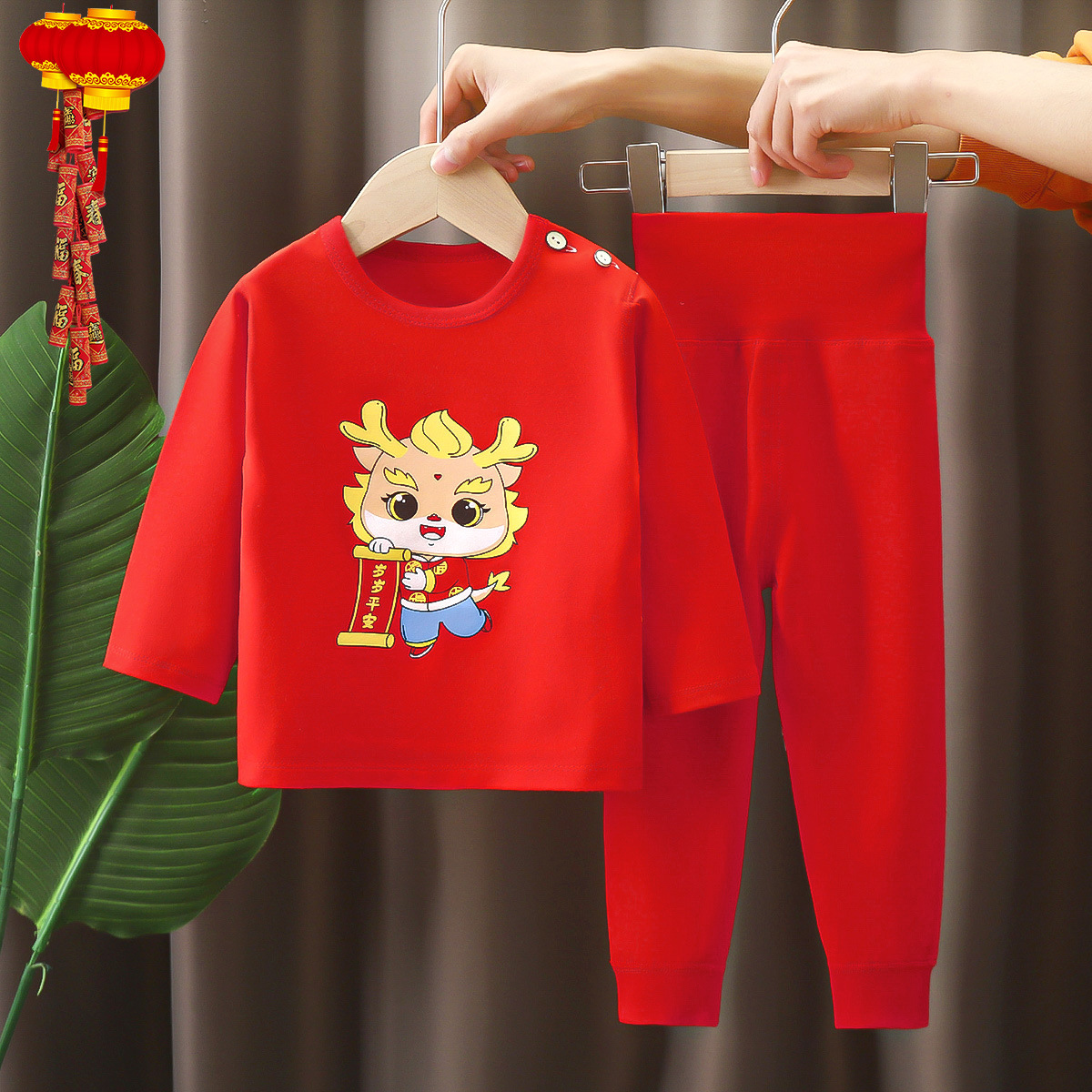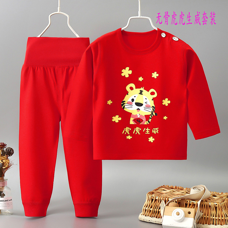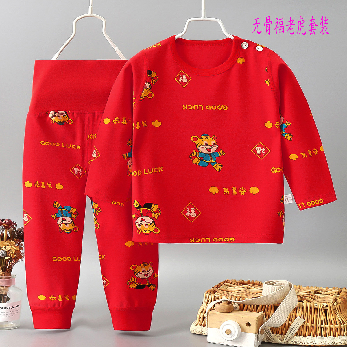 아기 뼈없는 세트 빨간 면 하이 웨이스트 배꼽 보호 속옷 세트 아기 소년과 소녀 가을 옷 가을 바지 새해 세트
