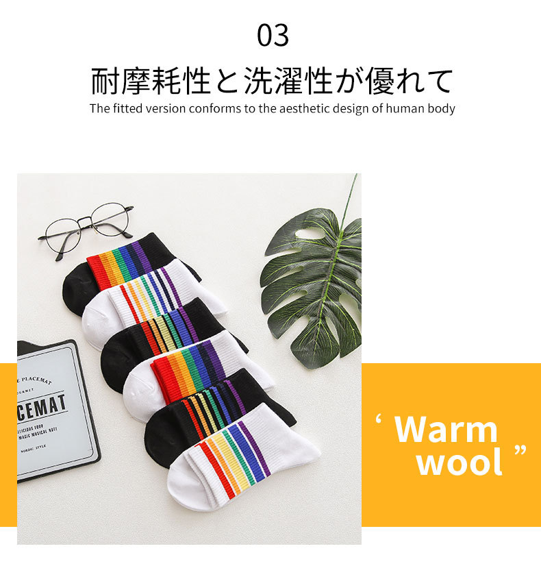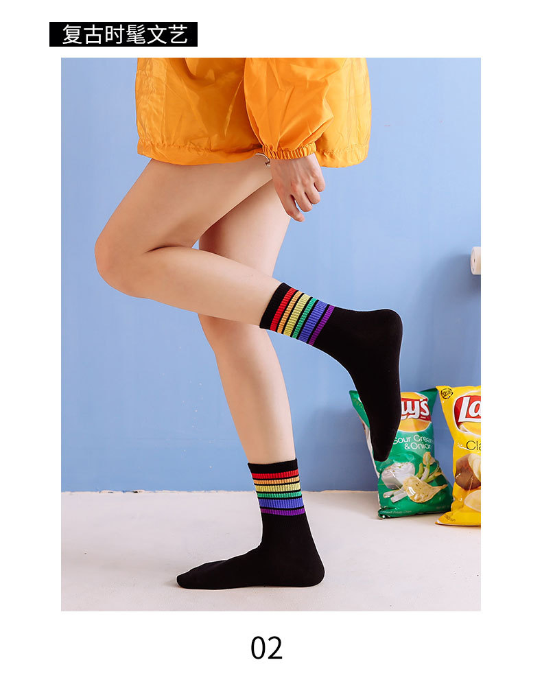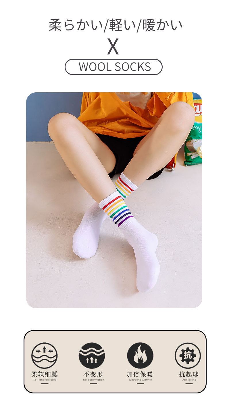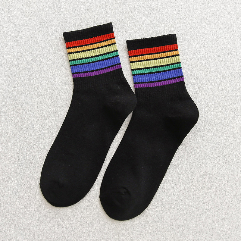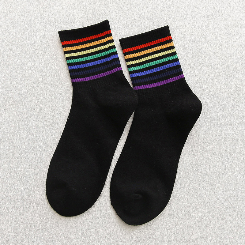 가을과 겨울 새로운 편안한면 양말 무지개 양말 줄무늬 간단한 따뜻한 튜브 양말 학술 스타일 흑백 도매
