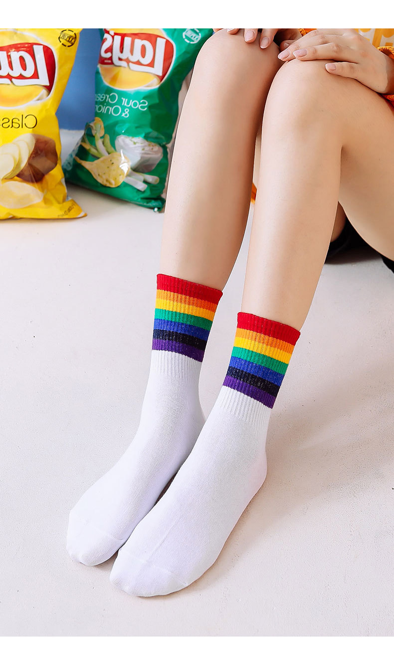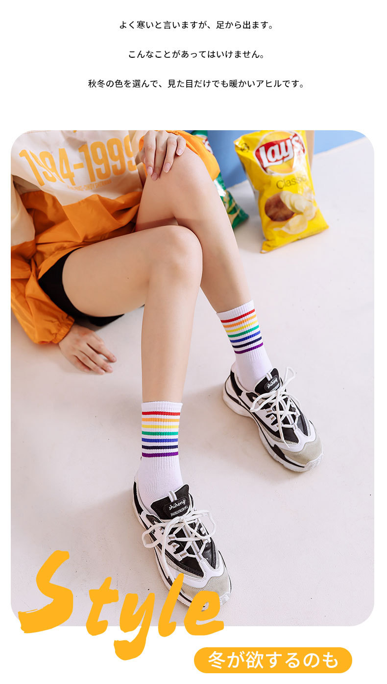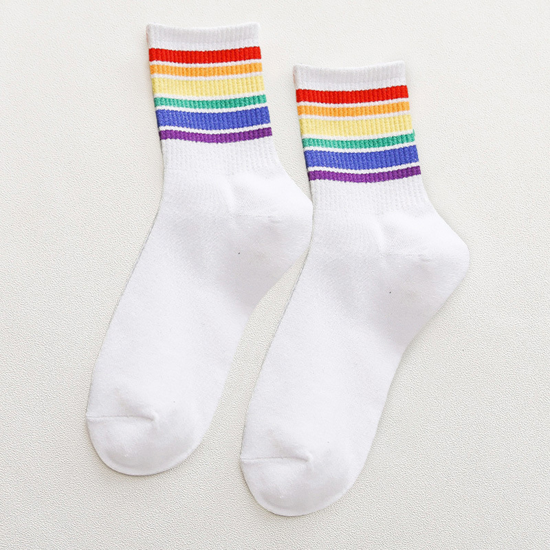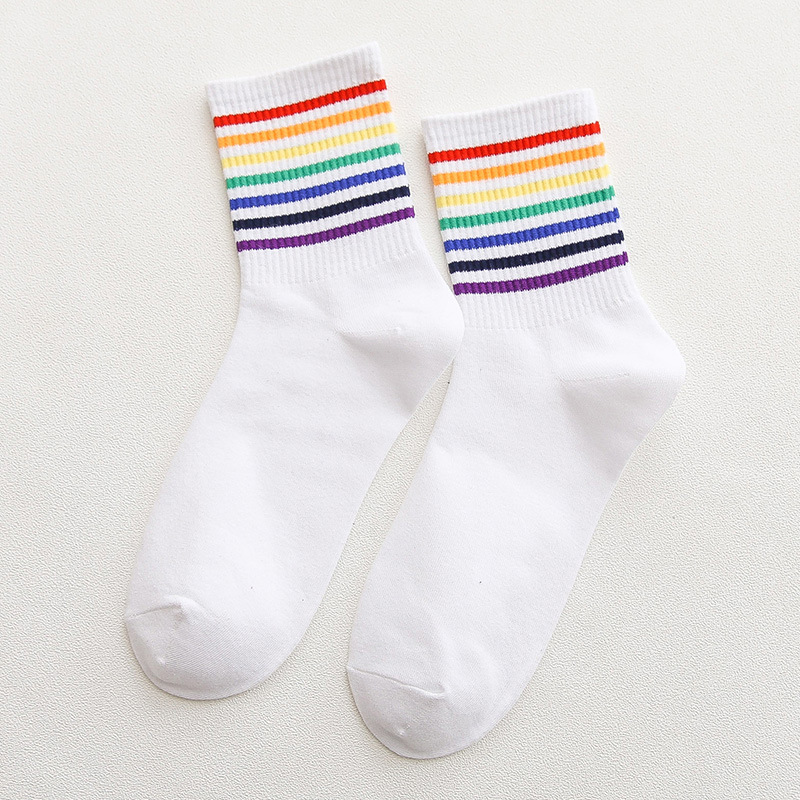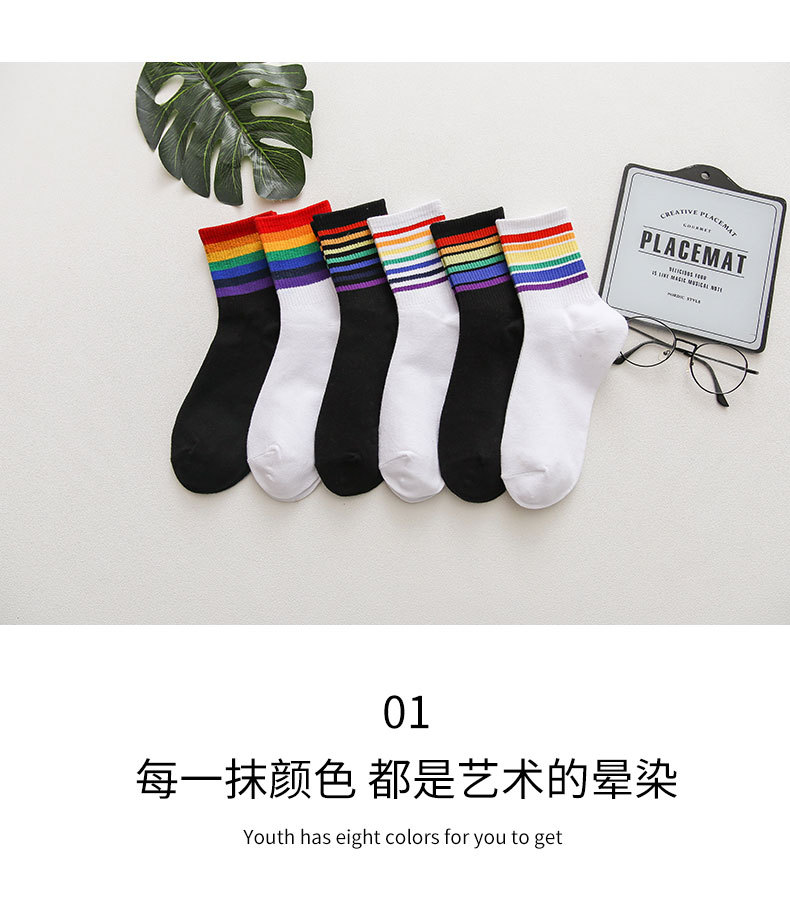 가을과 겨울 새로운 편안한면 양말 무지개 양말 줄무늬 간단한 따뜻한 튜브 양말 학술 스타일 흑백 도매