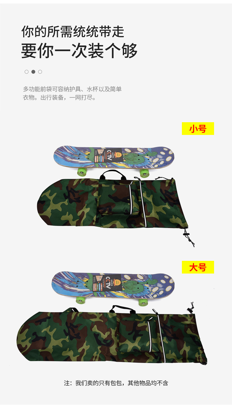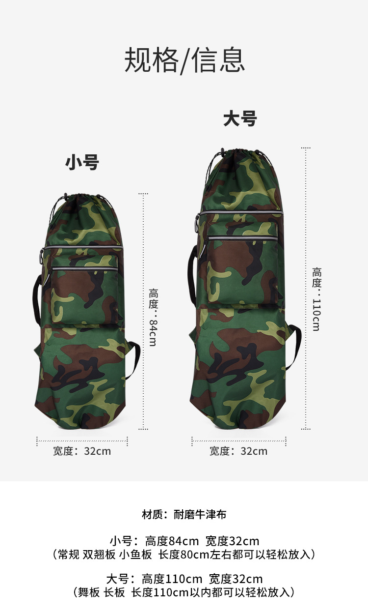 小号(84cmX32cm): 适用于所装物体长度83厘米以内,宽度+厚度之和小于32厘米的双翘板滑板,小鱼板,曲棍球,脚蹼,羽毛球拍,网球拍,瑜伽,折叠椅等。