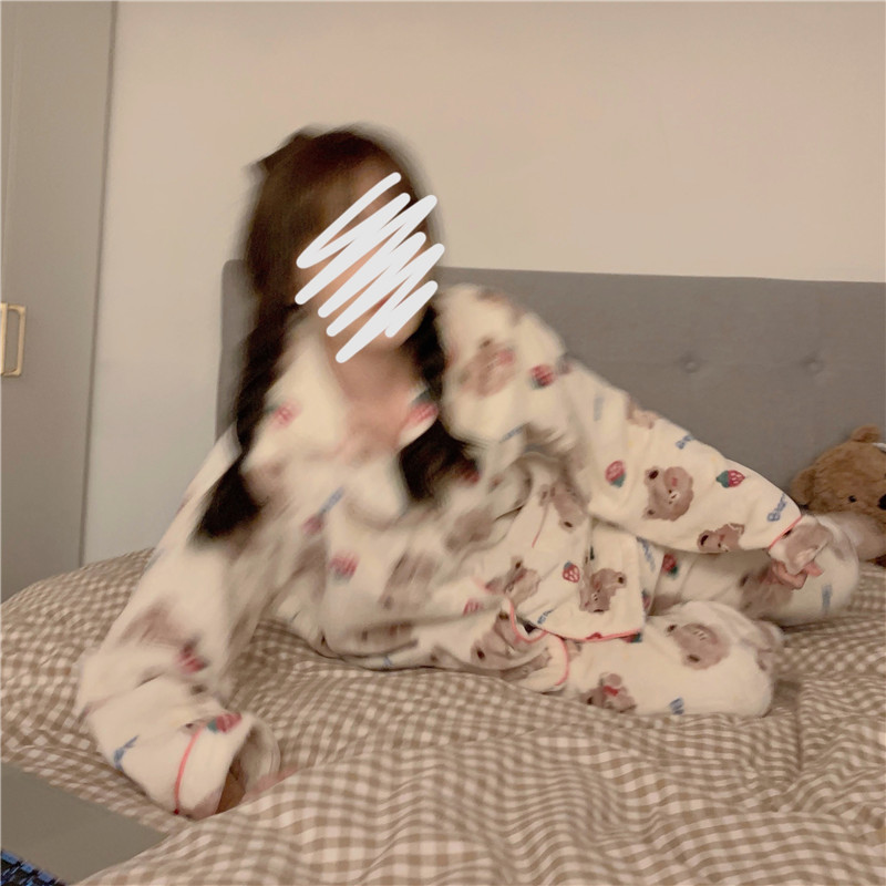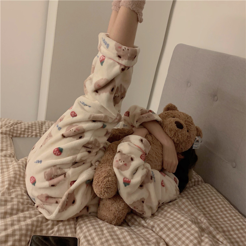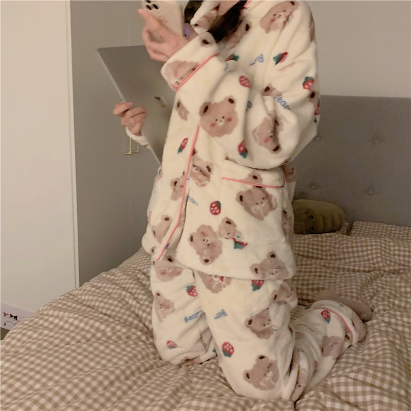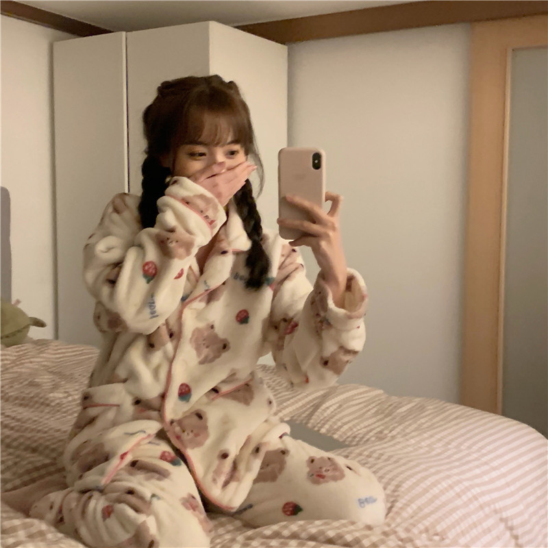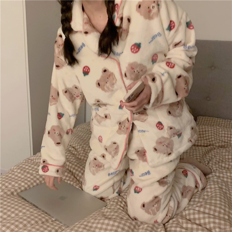 리얼 샷 2021 새로운 딸기 곰 ~ 따뜻한 플란넬 귀여운 소녀 학생 가정 옷 잠옷 세트 겨울 여성