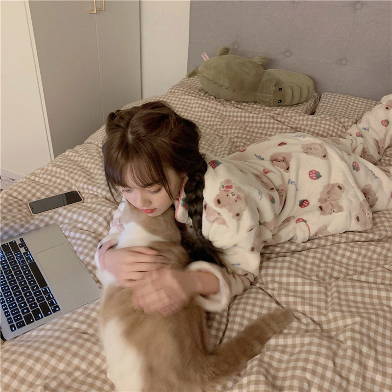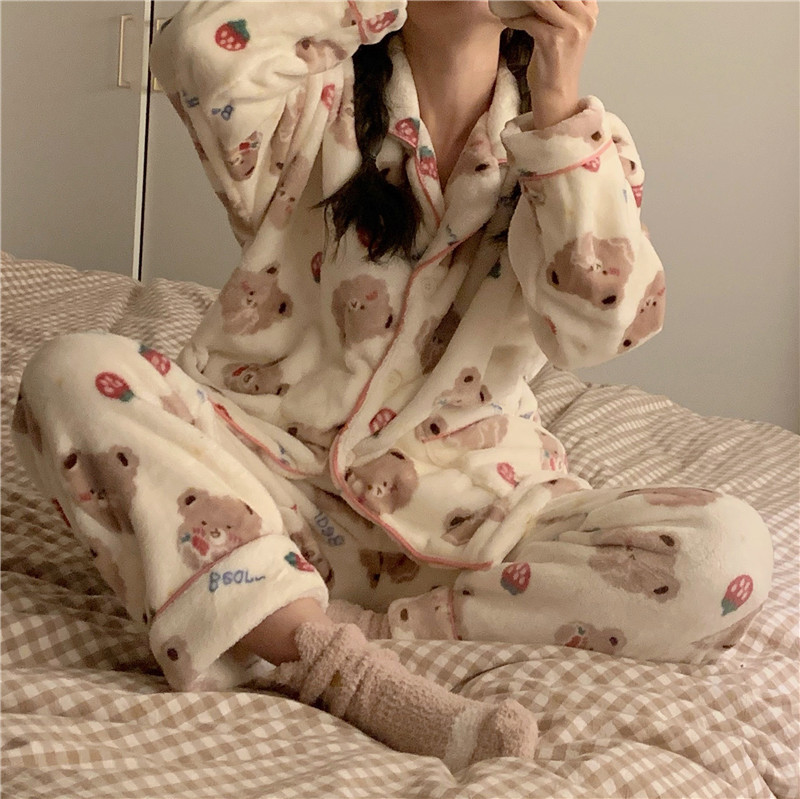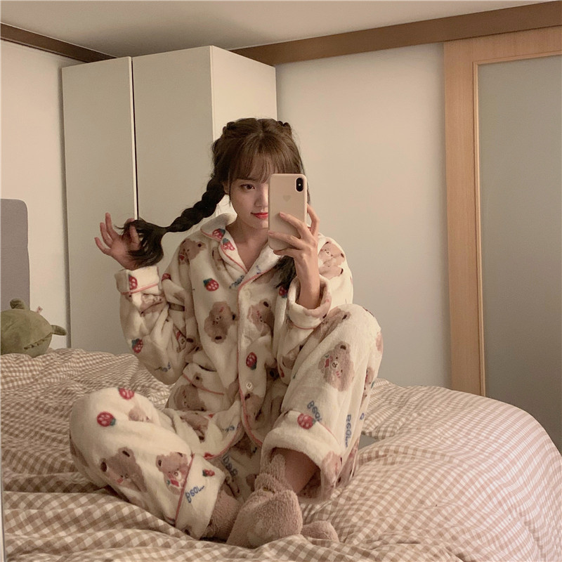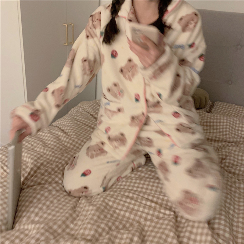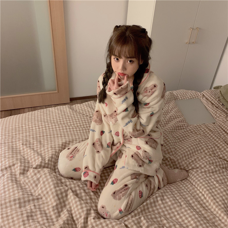 리얼 샷 2021 새로운 딸기 곰 ~ 따뜻한 플란넬 귀여운 소녀 학생 가정 옷 잠옷 세트 겨울 여성
