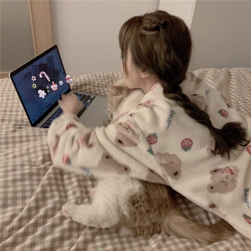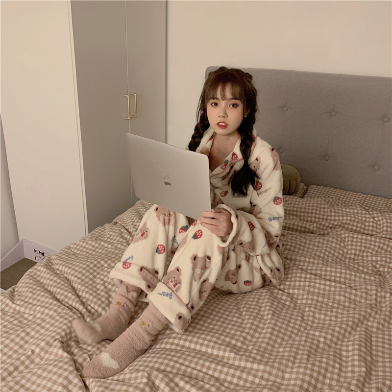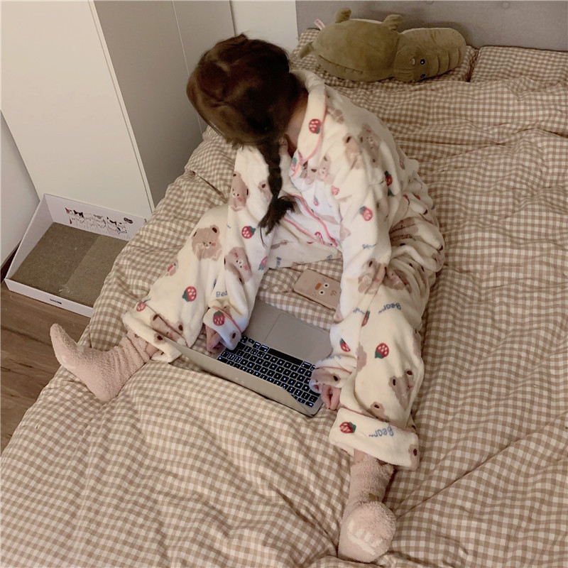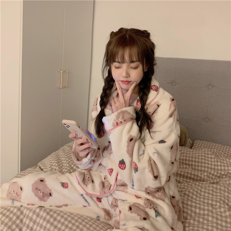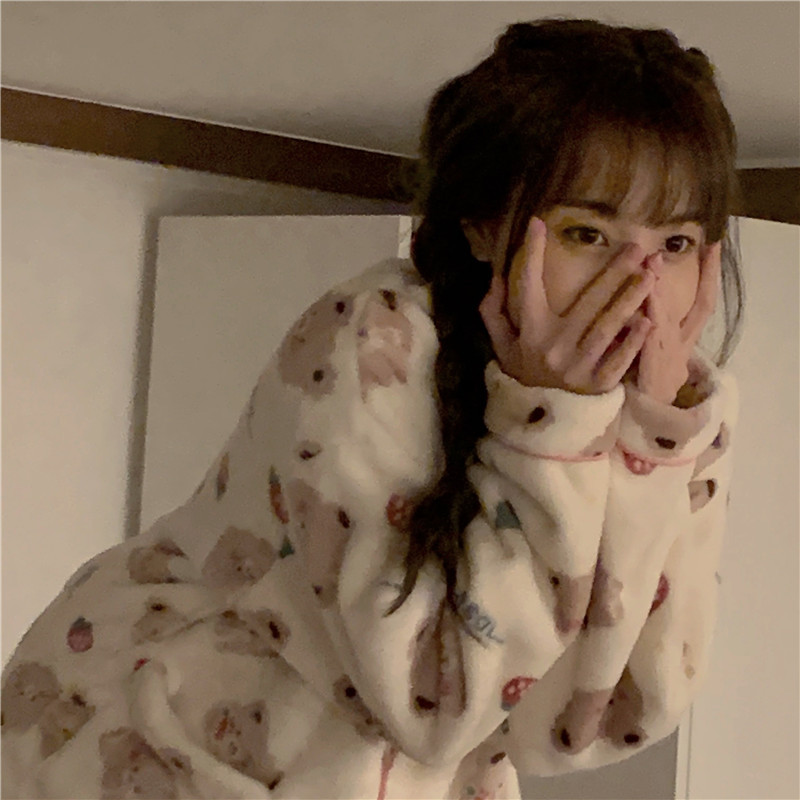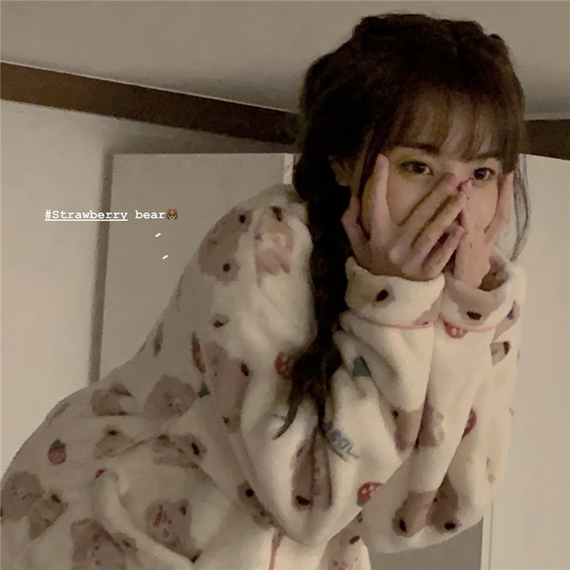 리얼 샷 2021 새로운 딸기 곰 ~ 따뜻한 플란넬 귀여운 소녀 학생 가정 옷 잠옷 세트 겨울 여성스토어 가기