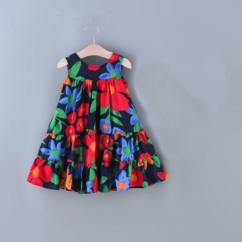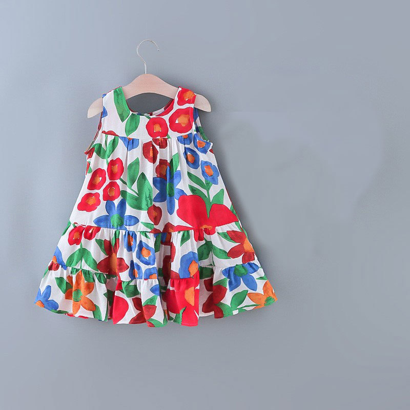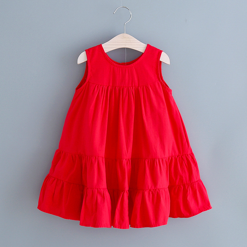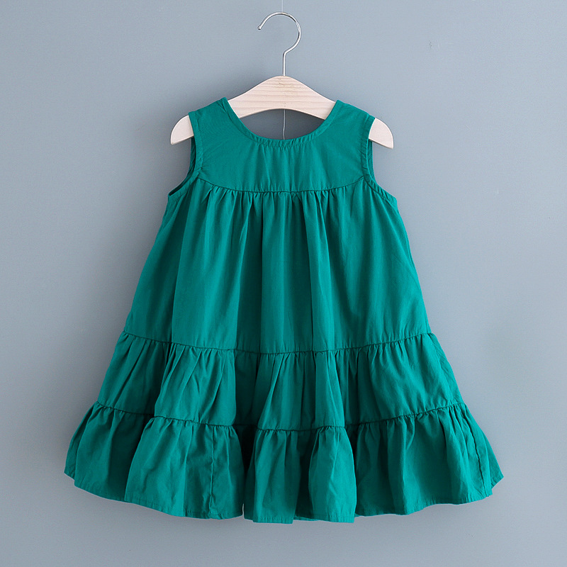 중간 및 작은 어린이 여름 민소매 라운드 넥 원피스 여자의 큰 치마 조끼 여자의 보물 단색 서양 스타일 스커트