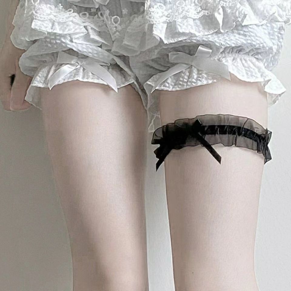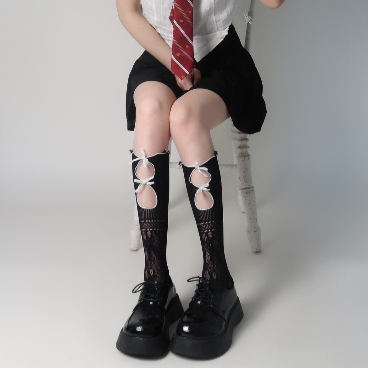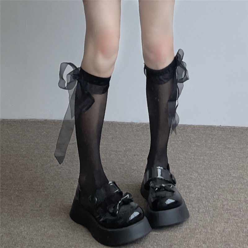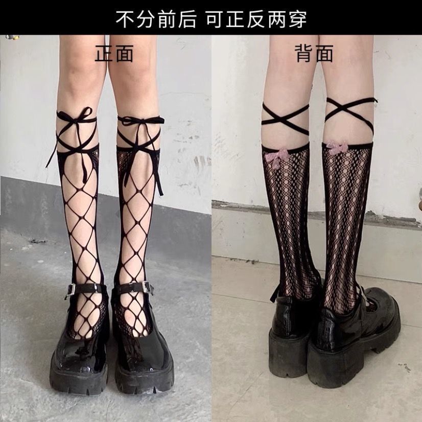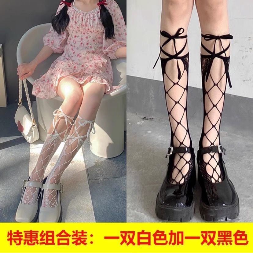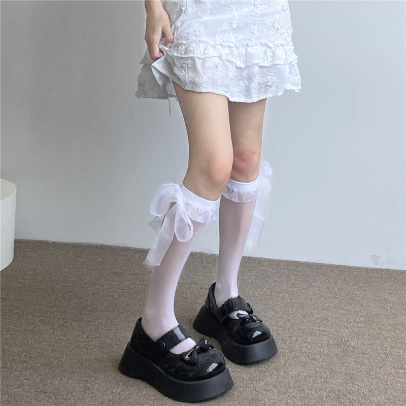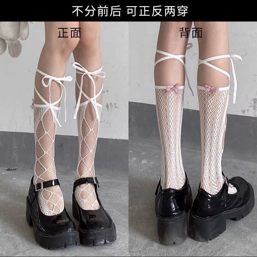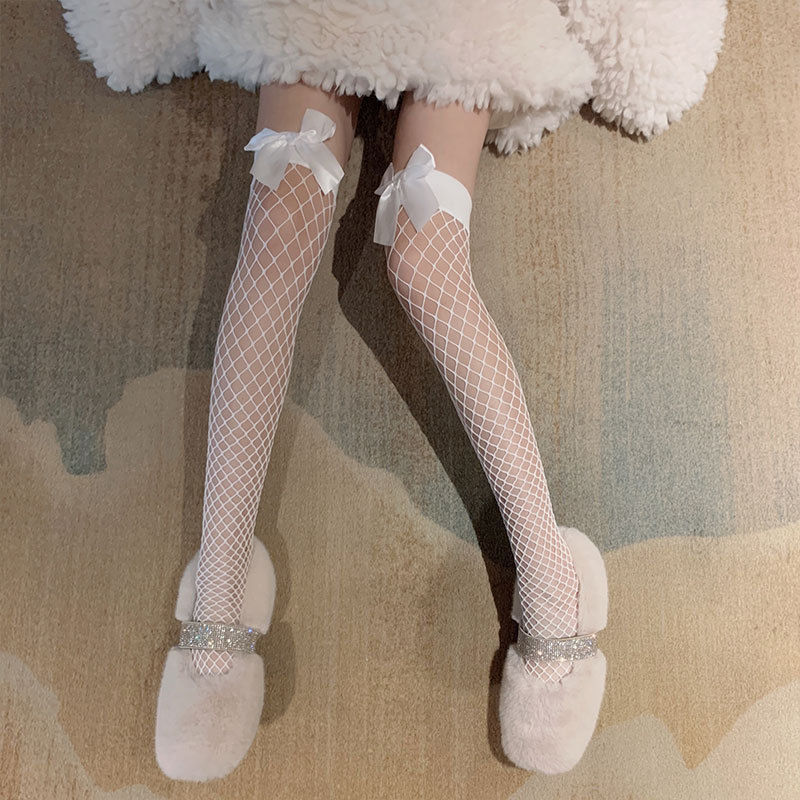 • 나비 매듭 긴 튜브 그물 스타킹 화이트