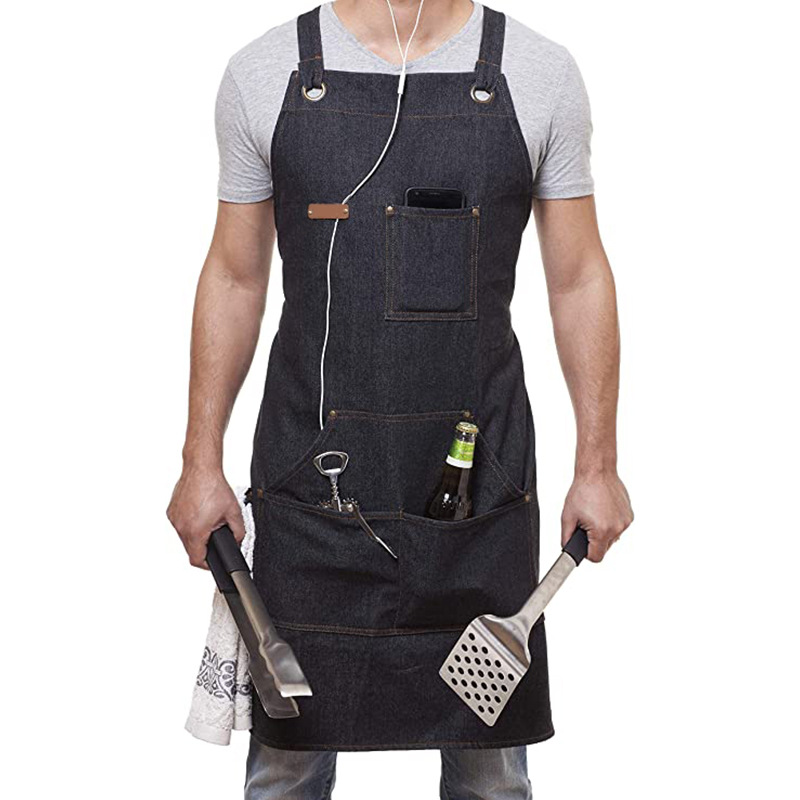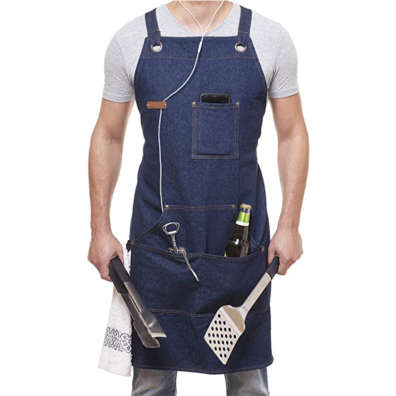 대외 무역 데님 앞치마 사용자 정의 로고 바베큐 커피 숍 원예 이발사 주방 작업 옷 앞치마 도매