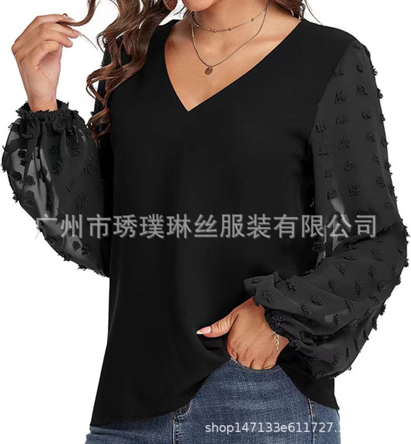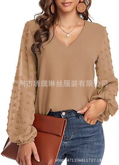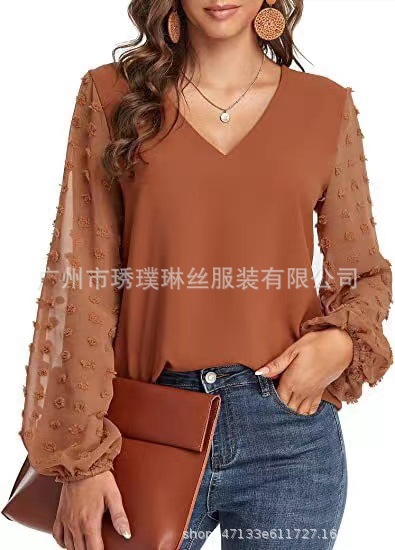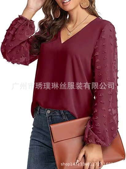 2021 새로운 유럽 및 미국 대외 무역 아마존 AliExpress 여성용 V 넥 쉬폰 셔츠 캐주얼 랜턴 소매 풀오버 탑