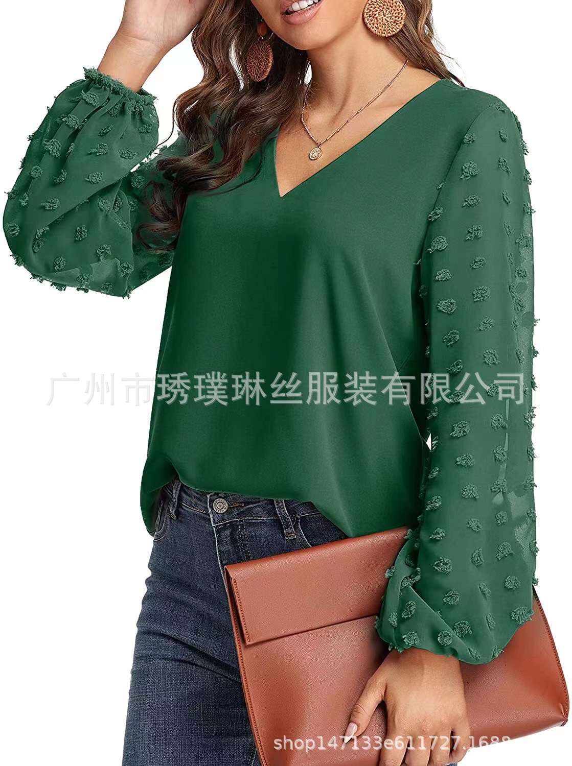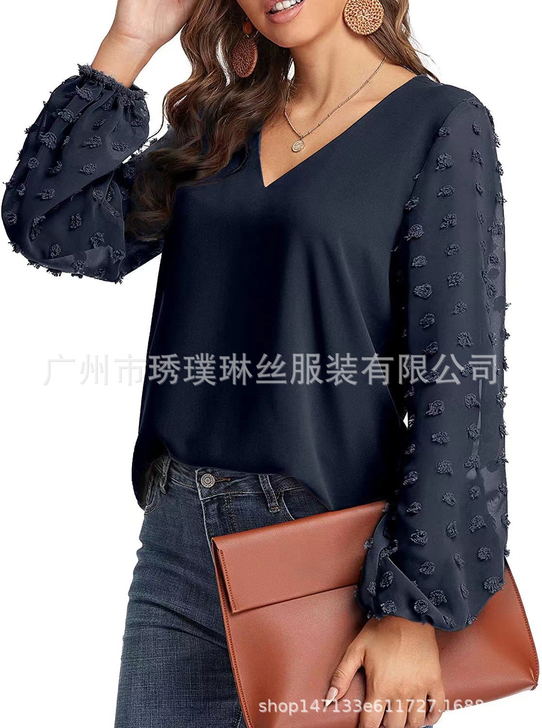 2021 새로운 유럽 및 미국 대외 무역 아마존 AliExpress 여성용 V 넥 쉬폰 셔츠 캐주얼 랜턴 소매 풀오버 탑스토어 가기