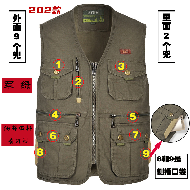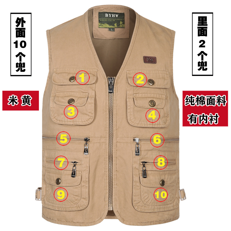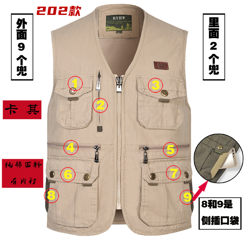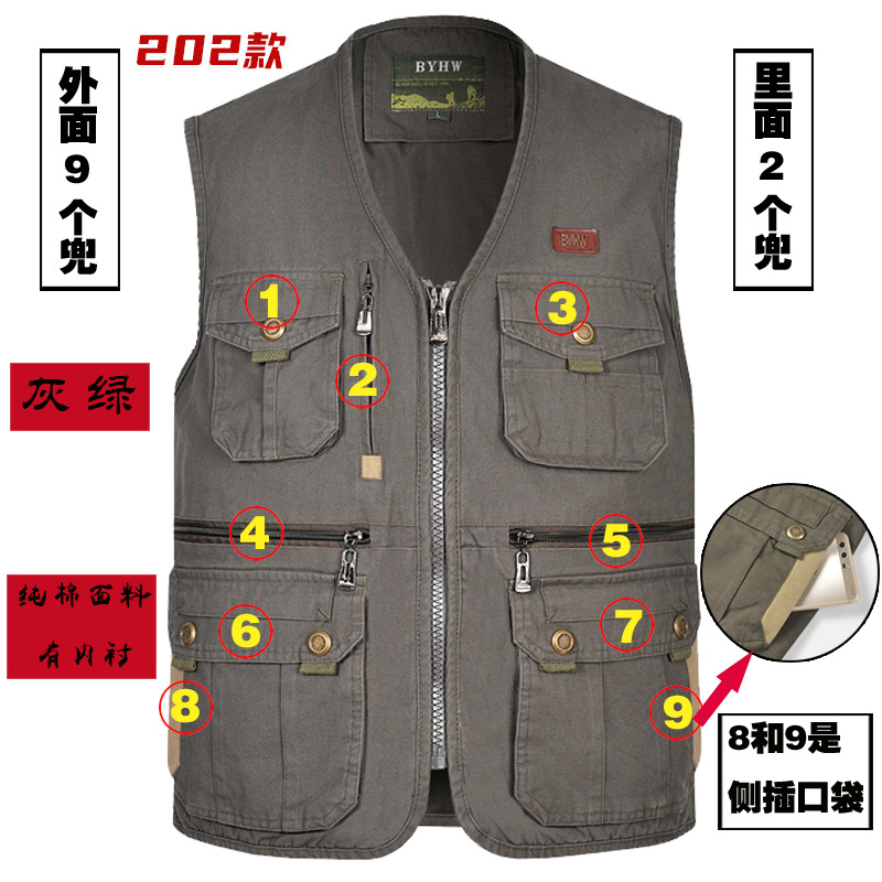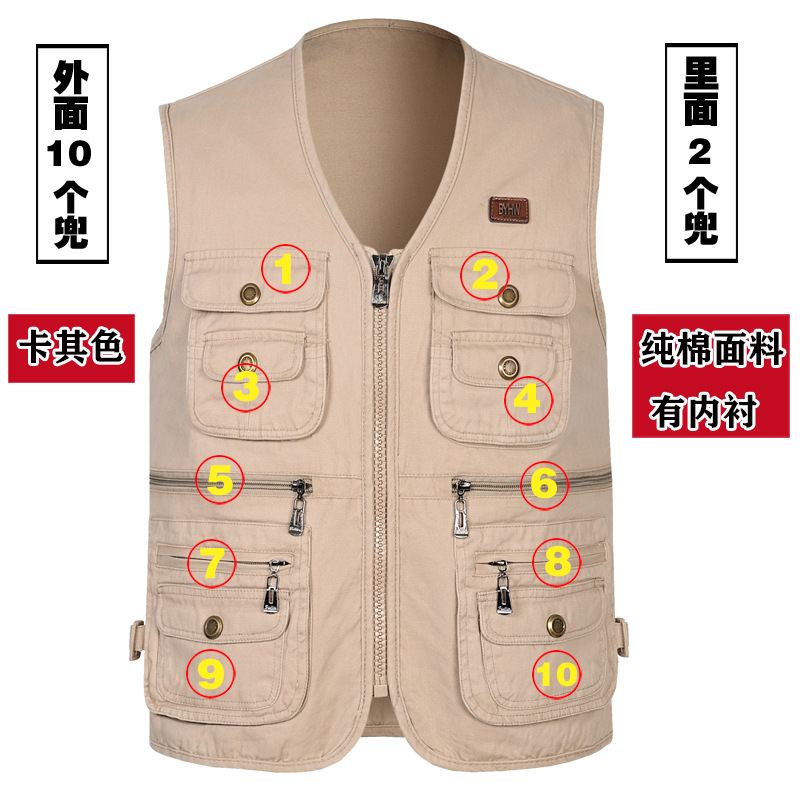 멀티 포켓 순면 조끼 중년 및 노인 남성 캐주얼 플러스 사이즈 도구 조끼 야외 여행 등산 조끼 재킷