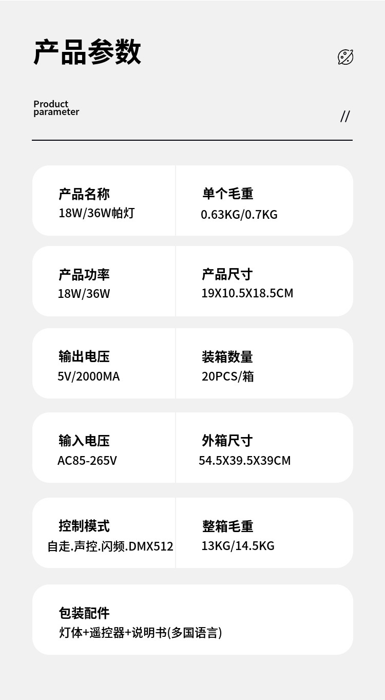 LED 7색 염색 조명 쇼 무대 조명 18W36W 파라이트 원격 제어 웨딩 파라이트 공연 조명 미니 레이저
