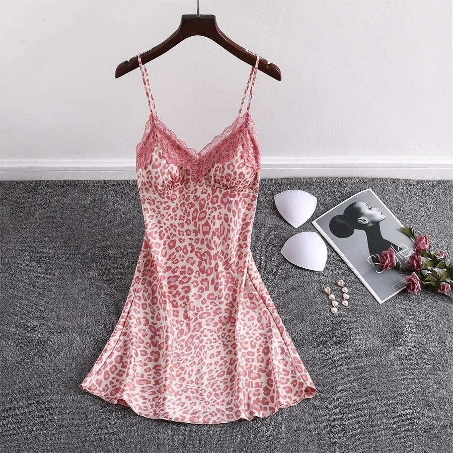 섹시한 레오파드 프린트 레이스 슬립 드레스 여성용 2021 여름 얇은 모델 가슴 패드 포함 작은 가슴을 위한 라운드넥 스타일스토어 가기