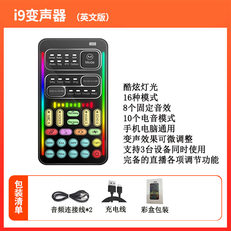 i9 보이스 체인저 휴대용 사운드 카드, 원클릭 음성 변조, 라이브 방송 노래용 휴대폰 및 컴퓨터 보이스 체인저스토어 가기