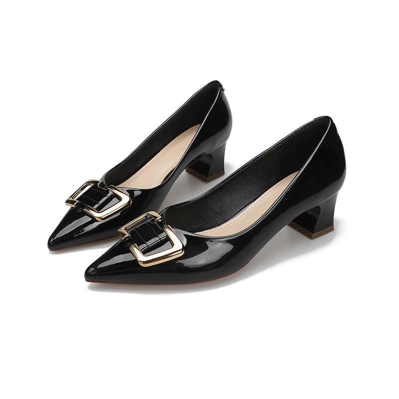 2025년 봄 신상 여성 중굽 구두, 두꺼운 굽 하이힐, 레드 페이턴트 가죽 웨딩 슈즈, 뾰족코 얕은 굽 사계절 신발스토어 가기