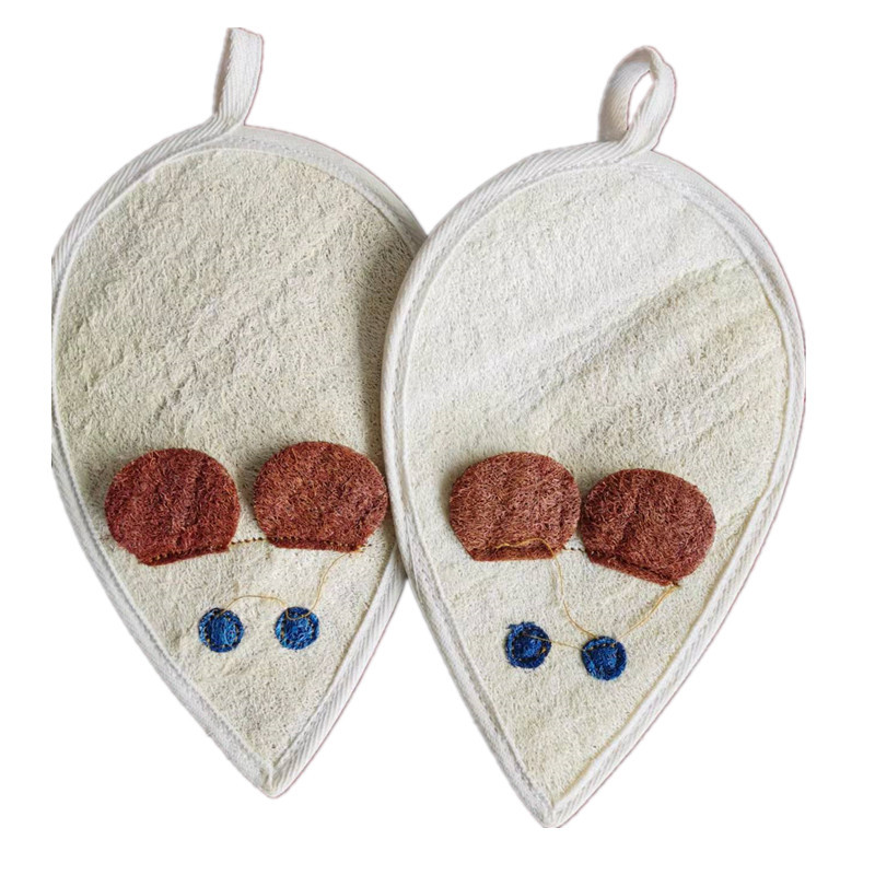 补充说明:选用厚实、致密、坚韧、粗糙的天然丝瓜络材料,纯棉包边,加挂钩,便于存放和使用;