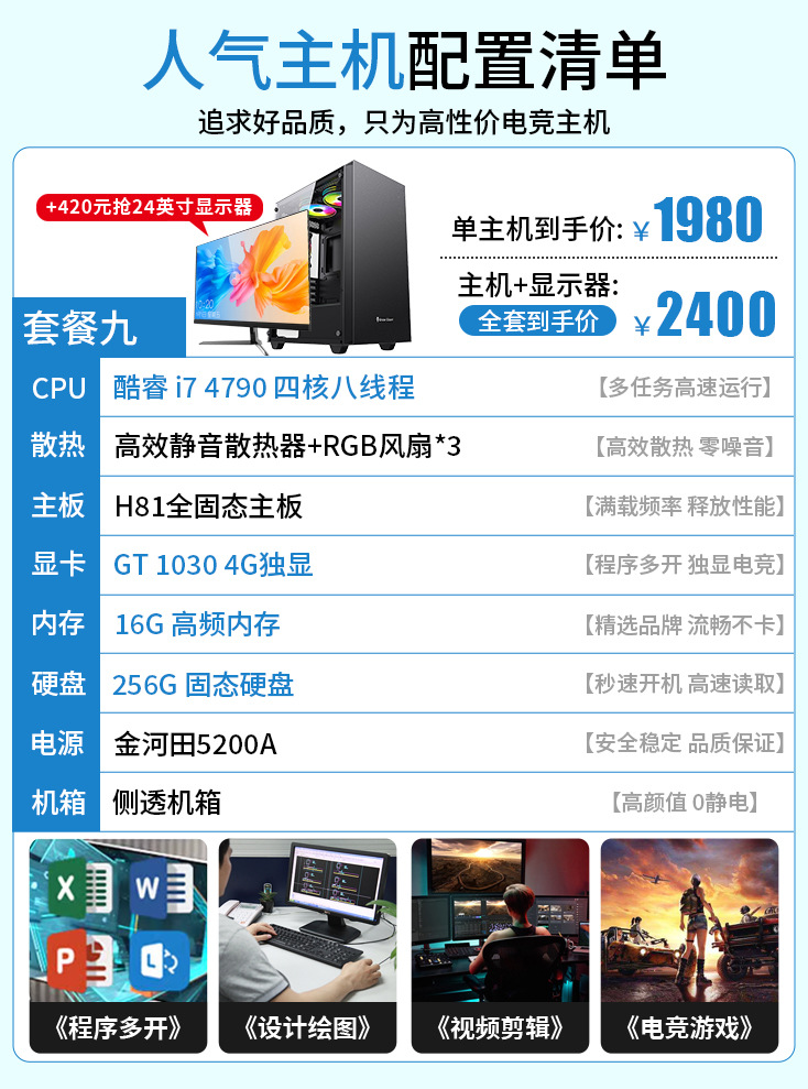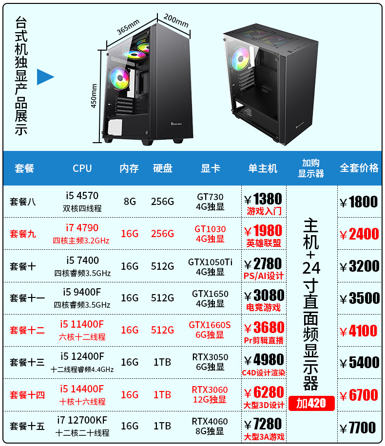 12G 독립 디스플레이 i3i5i7 인터넷 카페 e-스포츠 게임 데스크탑 컴퓨터 호스트 디자인 라이브 방송 조립 컴퓨터 전체 배치