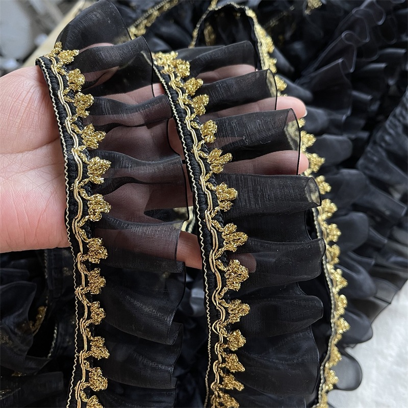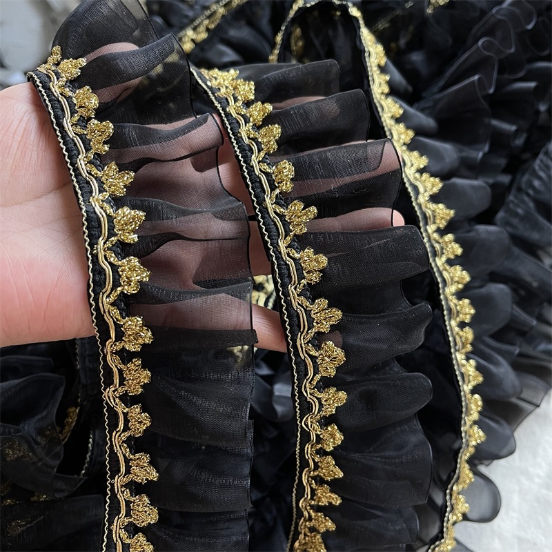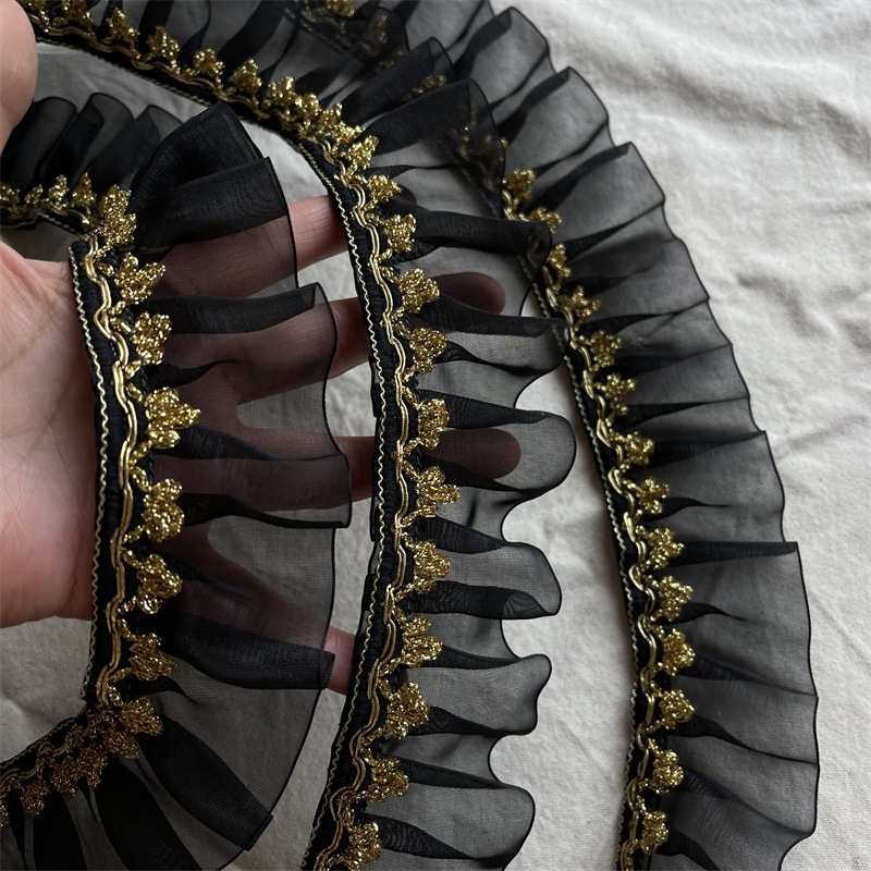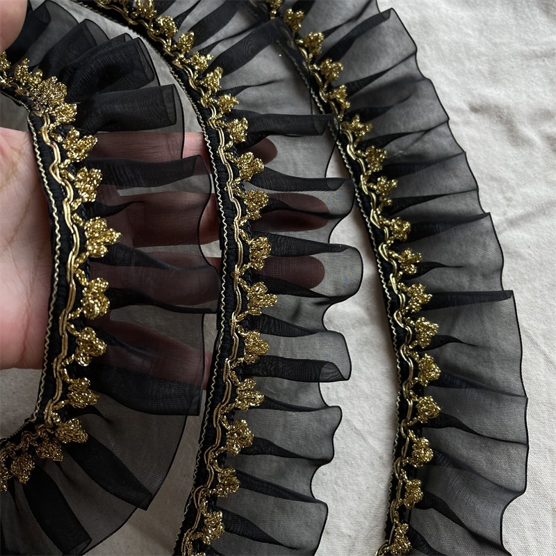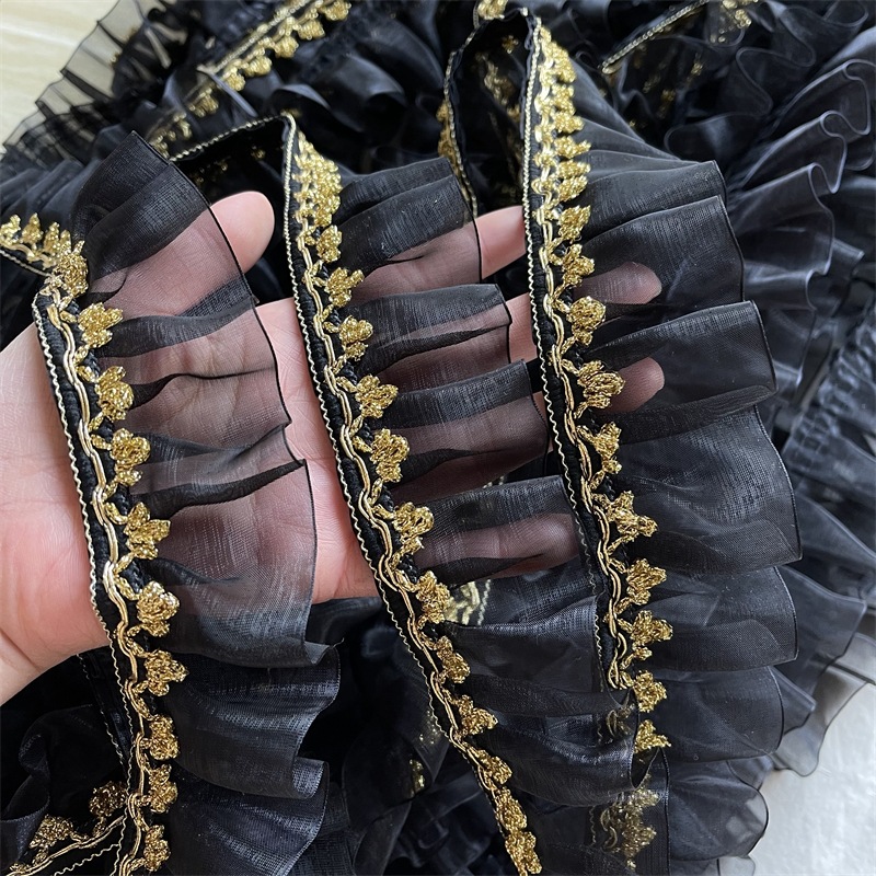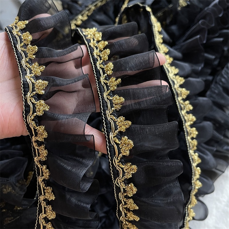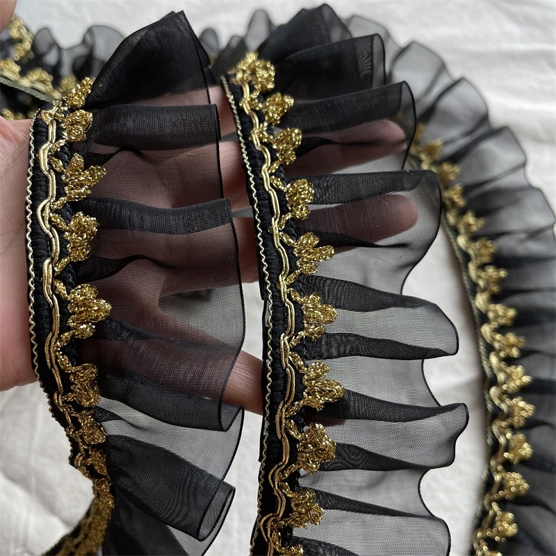 5cm 폭 검은 눈 거즈 골드 스레드 트림 3 차원 주름 로리타 스커트 커프 레이스 액세서리