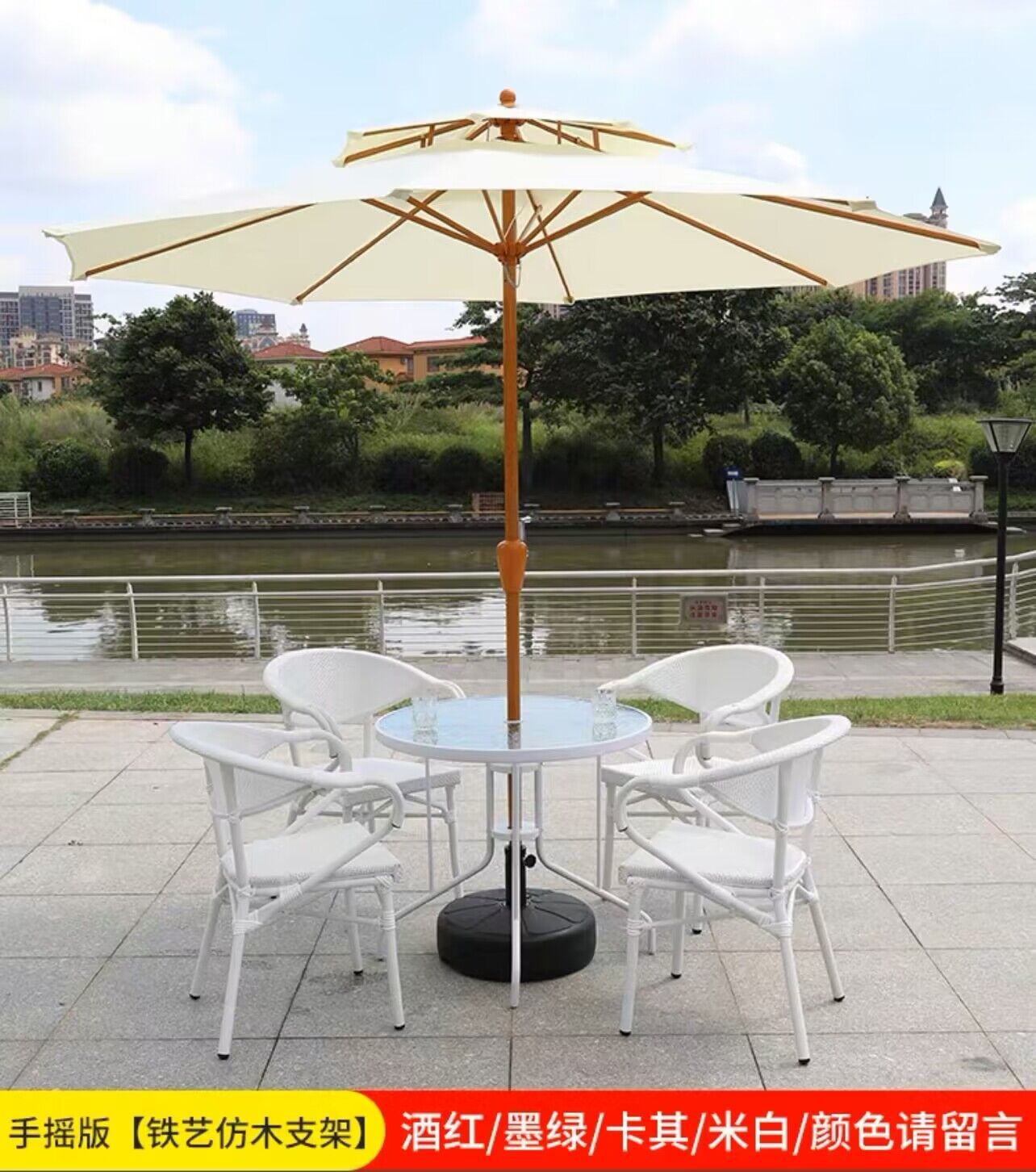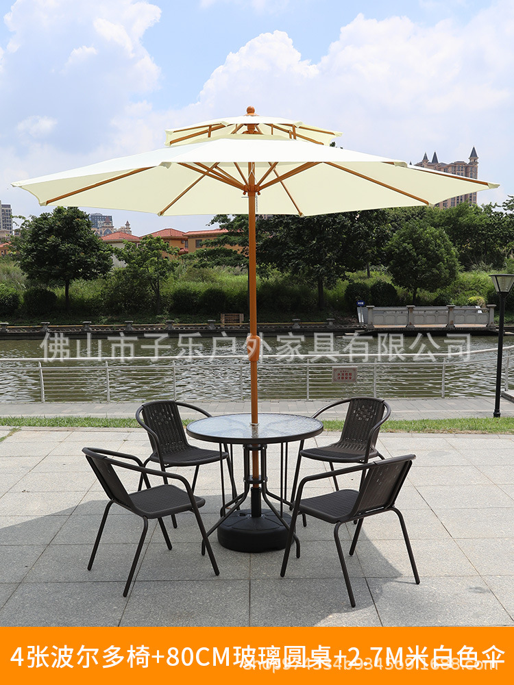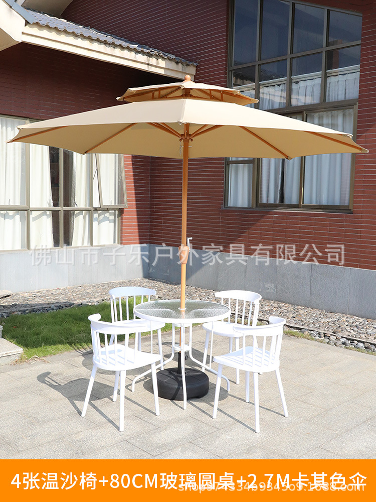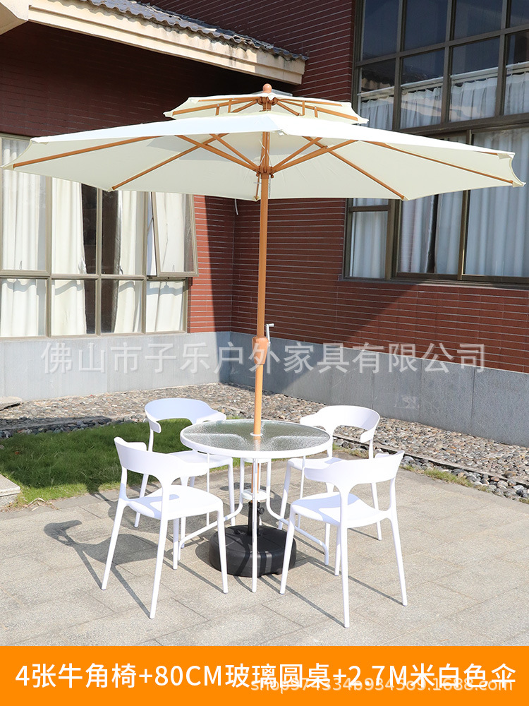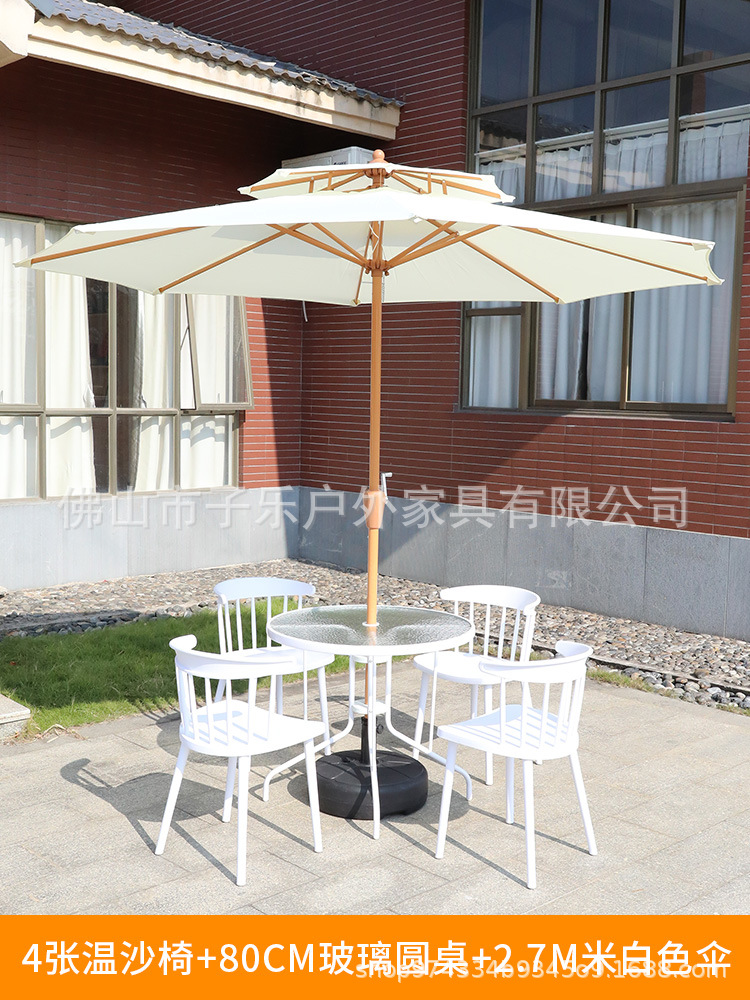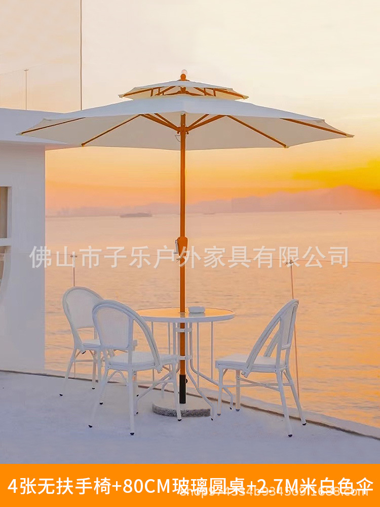 • 주요 그림: 2.7 m (아이보리) 우산 + 1 흰색 80 유리 원형 테이블 + 4 메쉬 안락 의자
