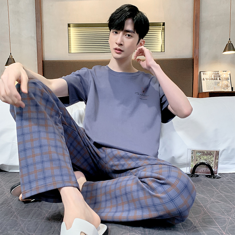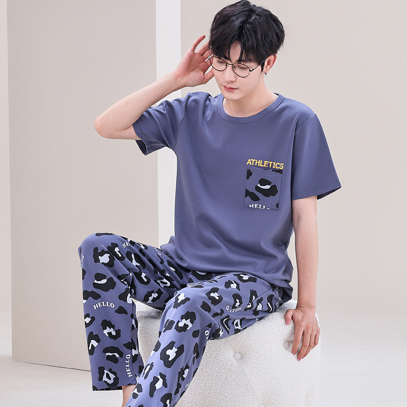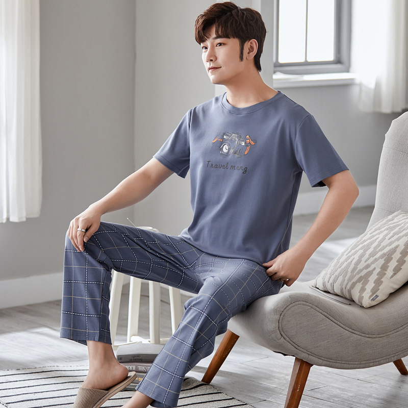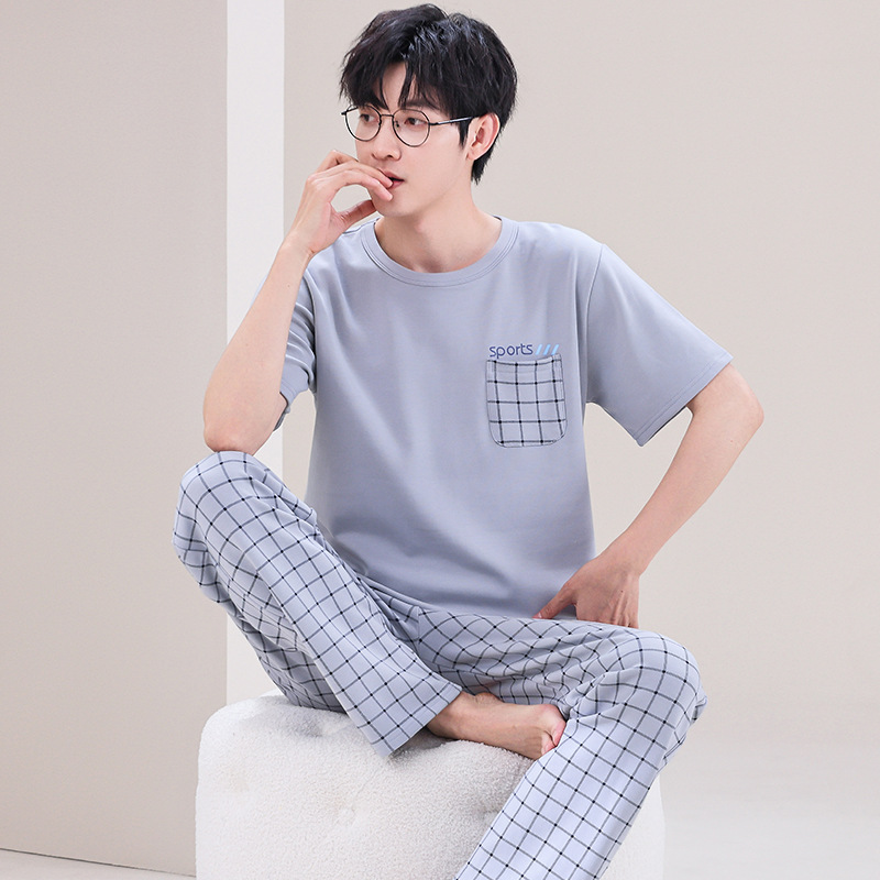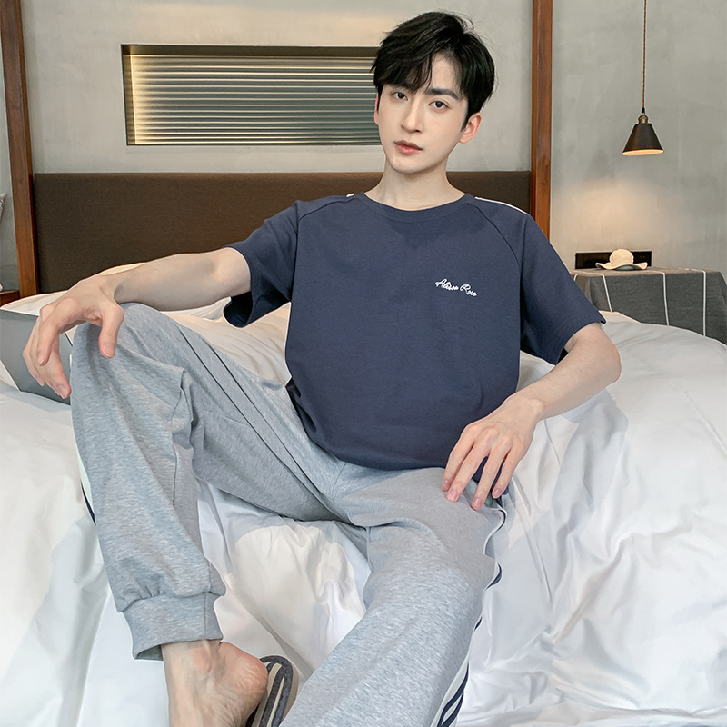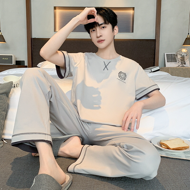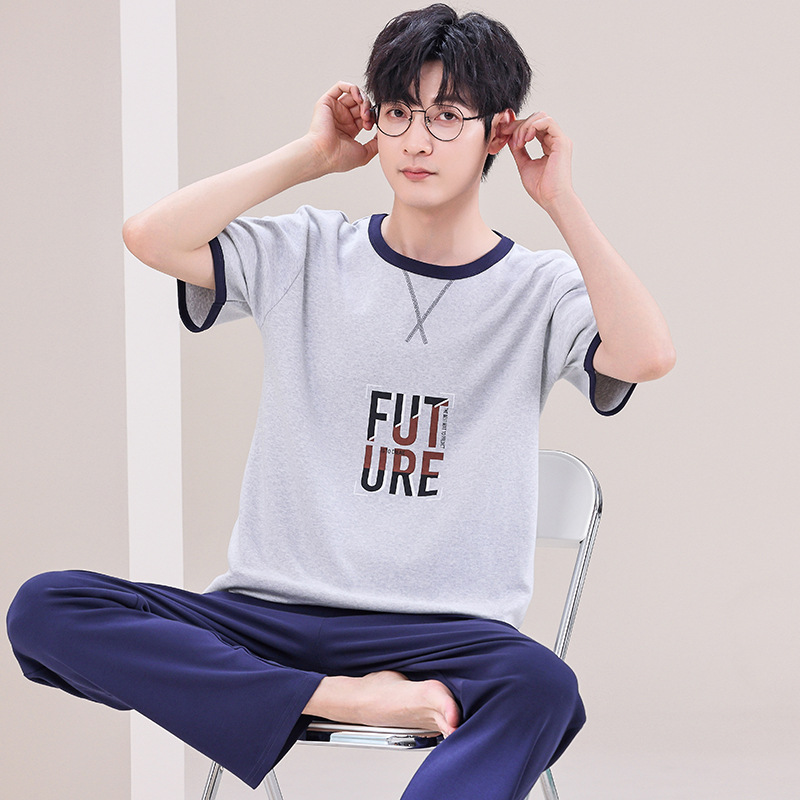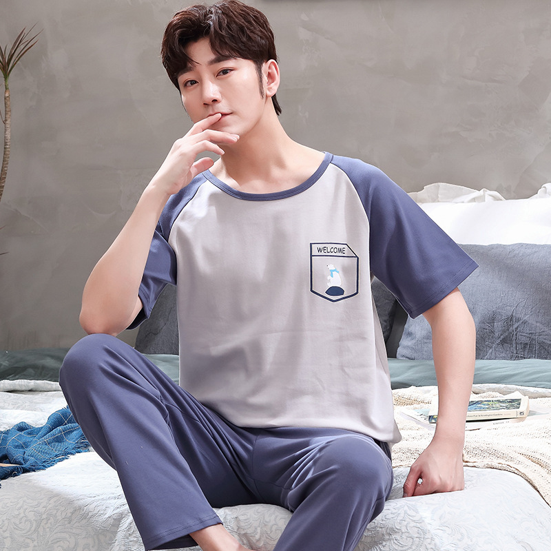 잠옷 남성용 여름 반팔 바지 심플 홈웨어 얇은 면 캐주얼 잠옷 어린 학생과 남성용 플러스 사이즈스토어 가기