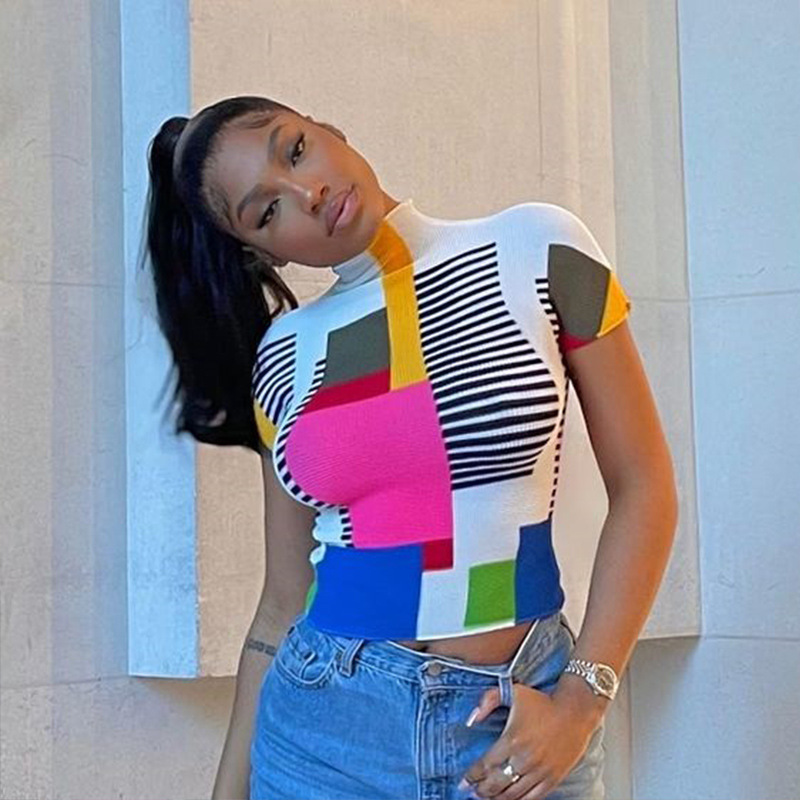 유럽과 미국의 국경 간 대외 무역 제조업체 2022 새로운 거리 유행 하프 하이 칼라 여성용 반팔 기하학적 인쇄 슬림 티셔츠