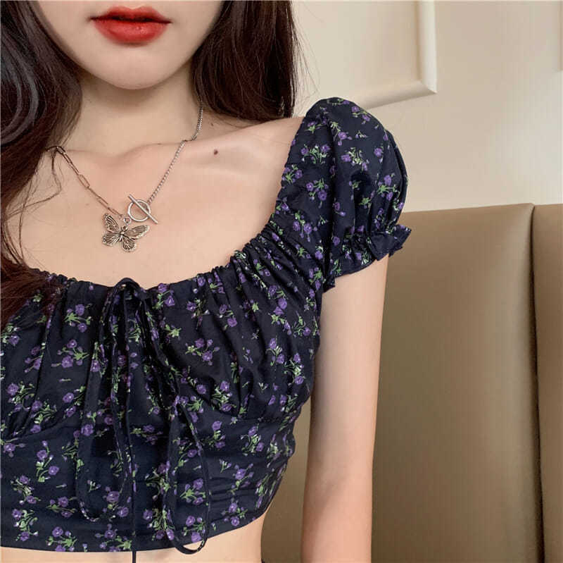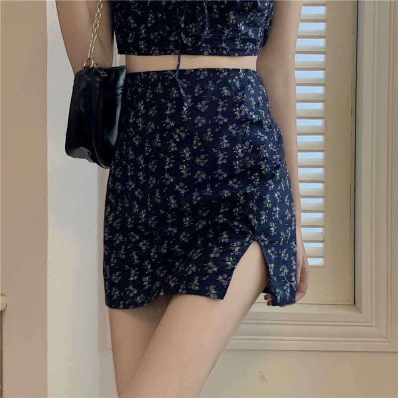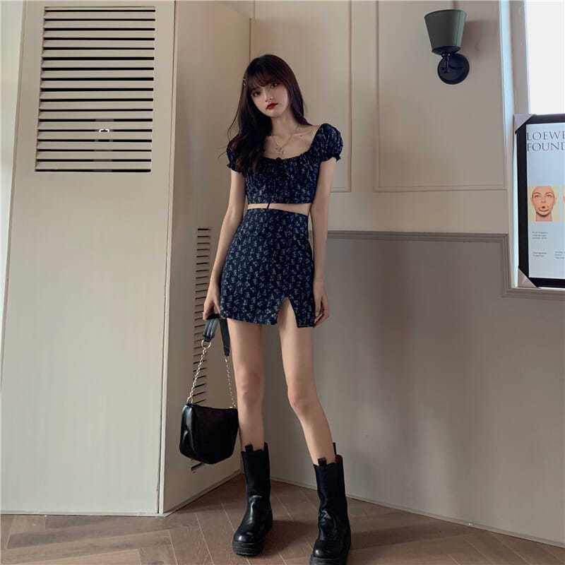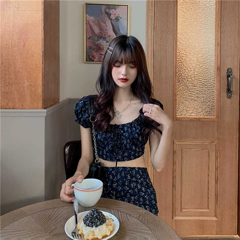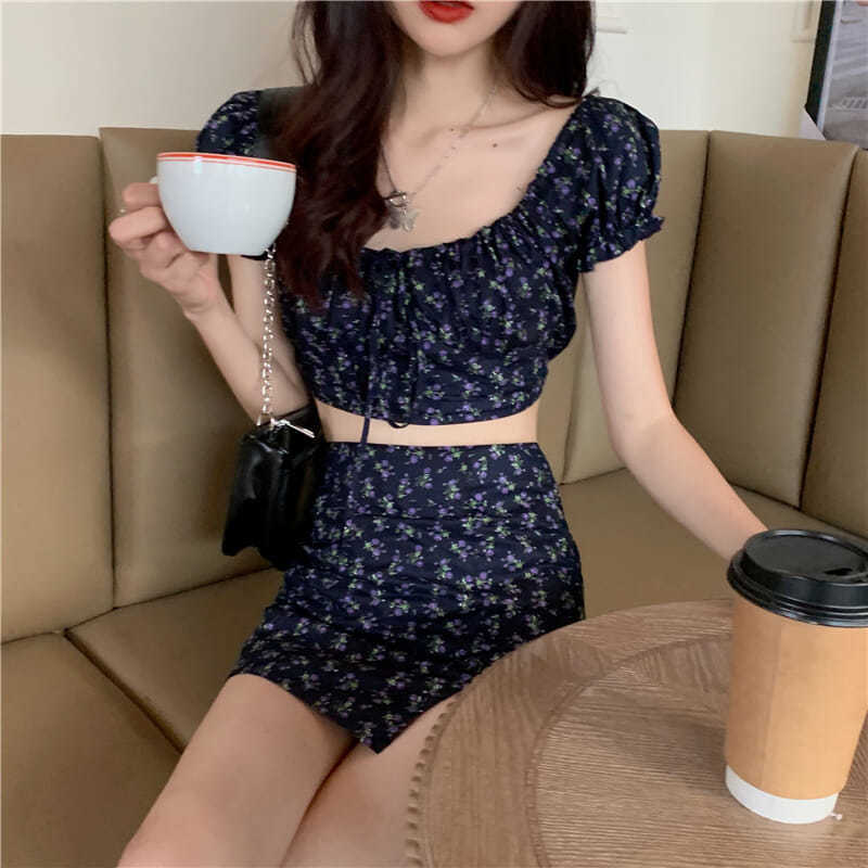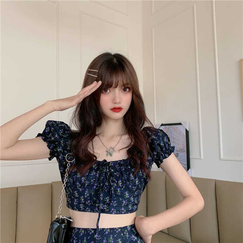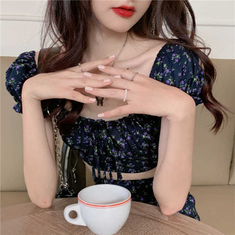 2024 여름 세트 여성의 밤 퍼플 로즈 버블 슬리브 배꼽 짧은 셔츠 꽃 조각 절반 길이 트렌디 스커트스토어 가기