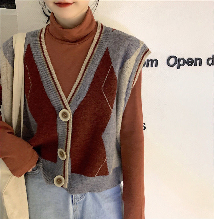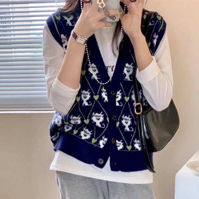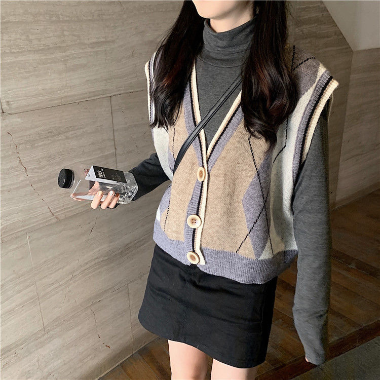 한국식 레트로 마름모꼴 니트 조끼 여성의 봄과 가을 V-넥 민소매 느슨한 스웨터 작은 조끼 외부 조끼스토어 가기