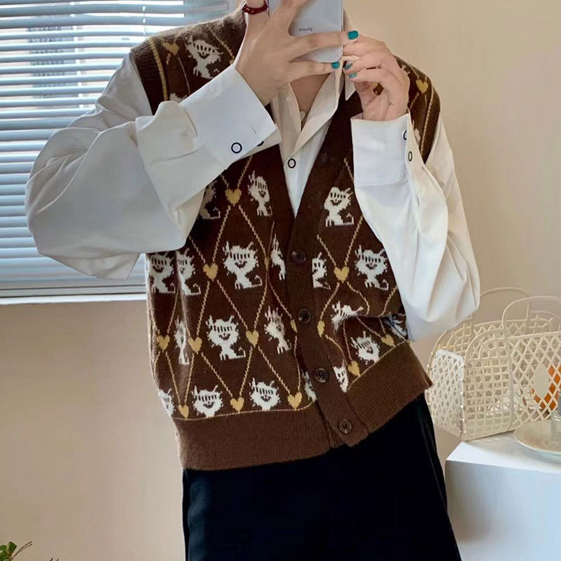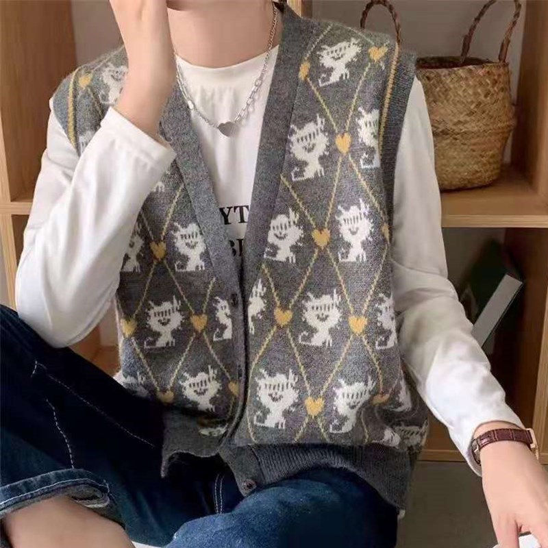 한국식 레트로 마름모꼴 니트 조끼 여성의 봄과 가을 V-넥 민소매 느슨한 스웨터 작은 조끼 외부 조끼
