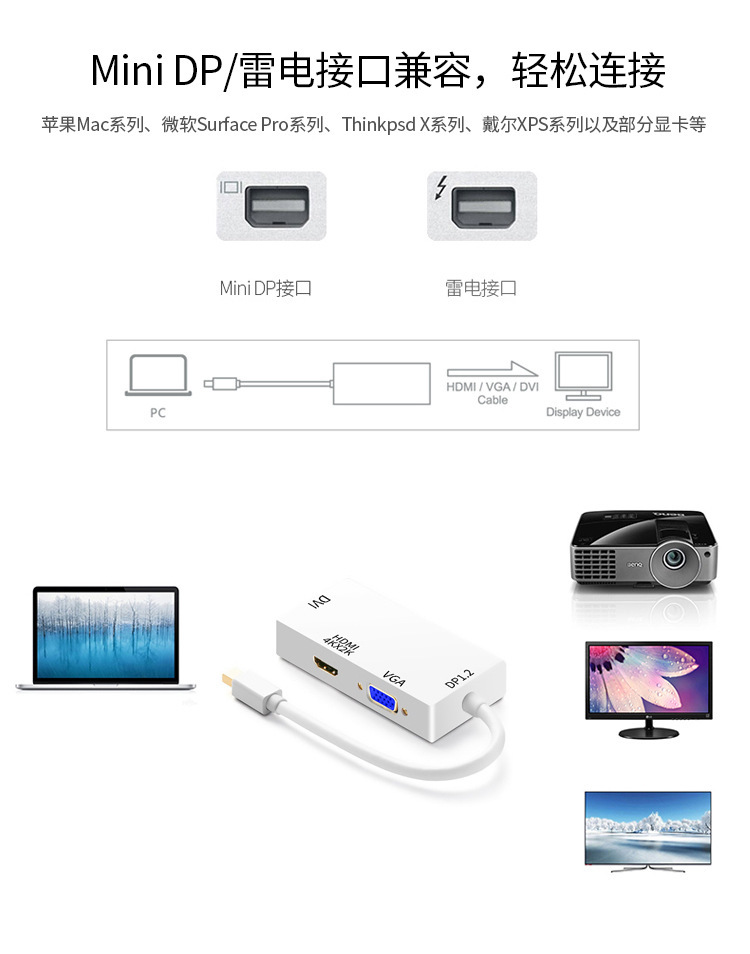 DP to HDTV VGA DVI 변환기 3-in-1 노트북 미니 라이트닝 어댑터 3-in-1 어댑터스토어 가기