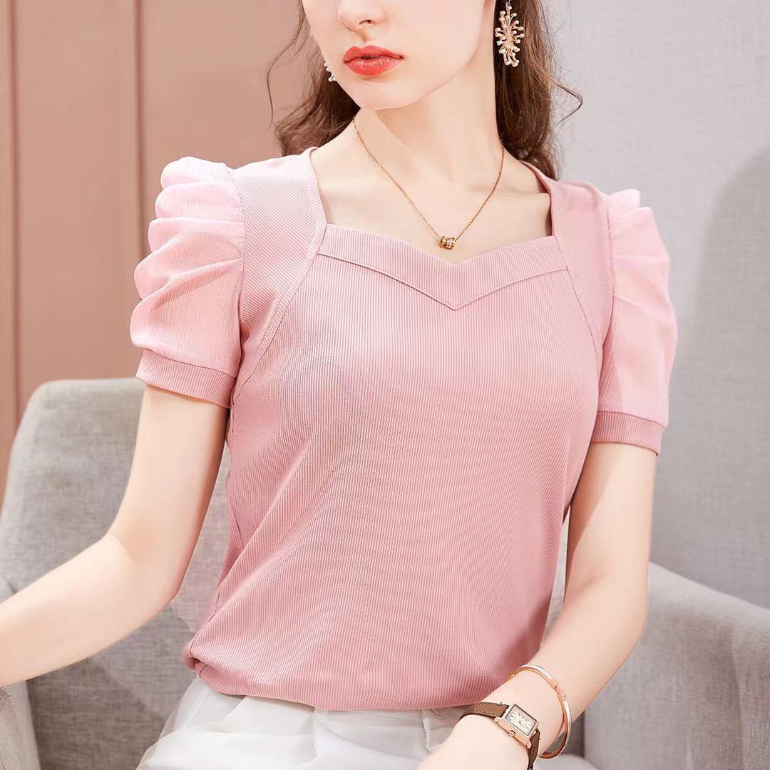 재고 아이스 실크 티셔츠 여성의 2021 새로운 여름 반팔 티셔츠 프랑스 스타일 코트 스타일 퍼프 슬리브 최신 유행스토어 가기