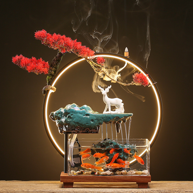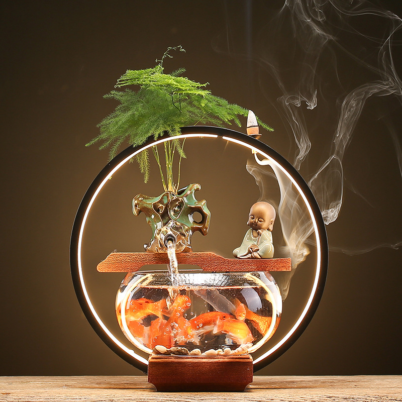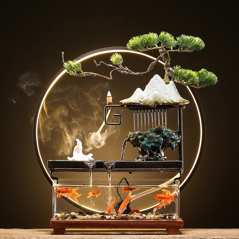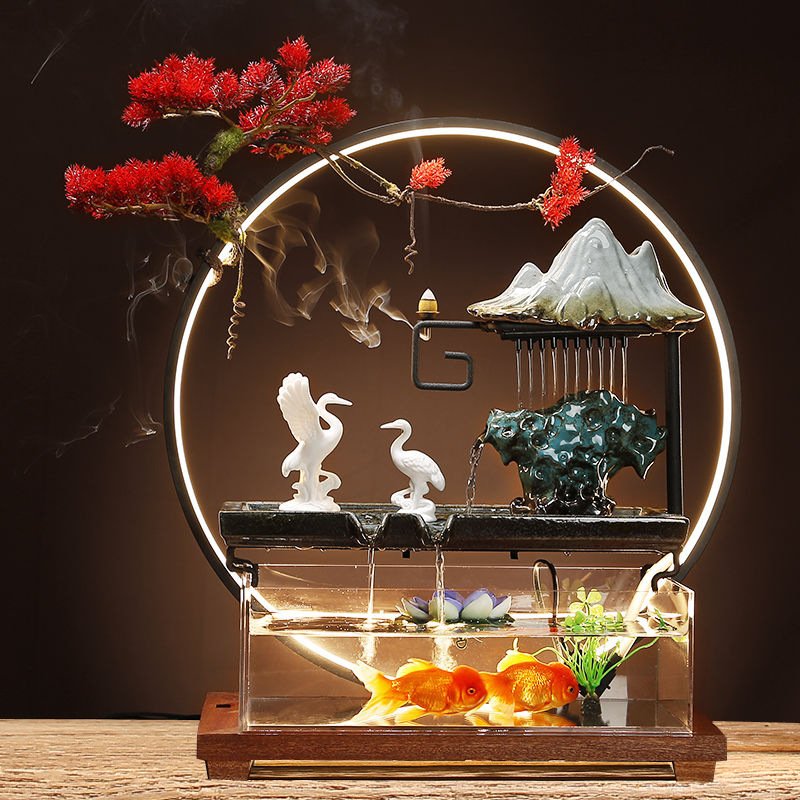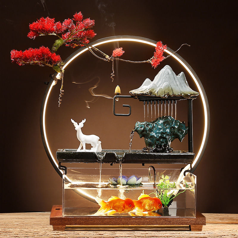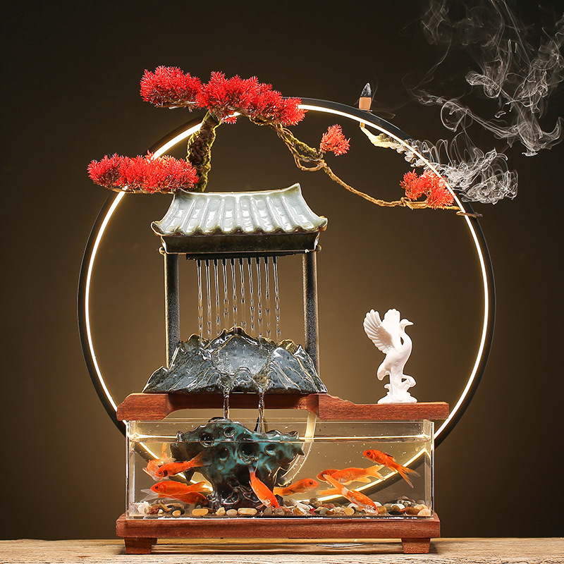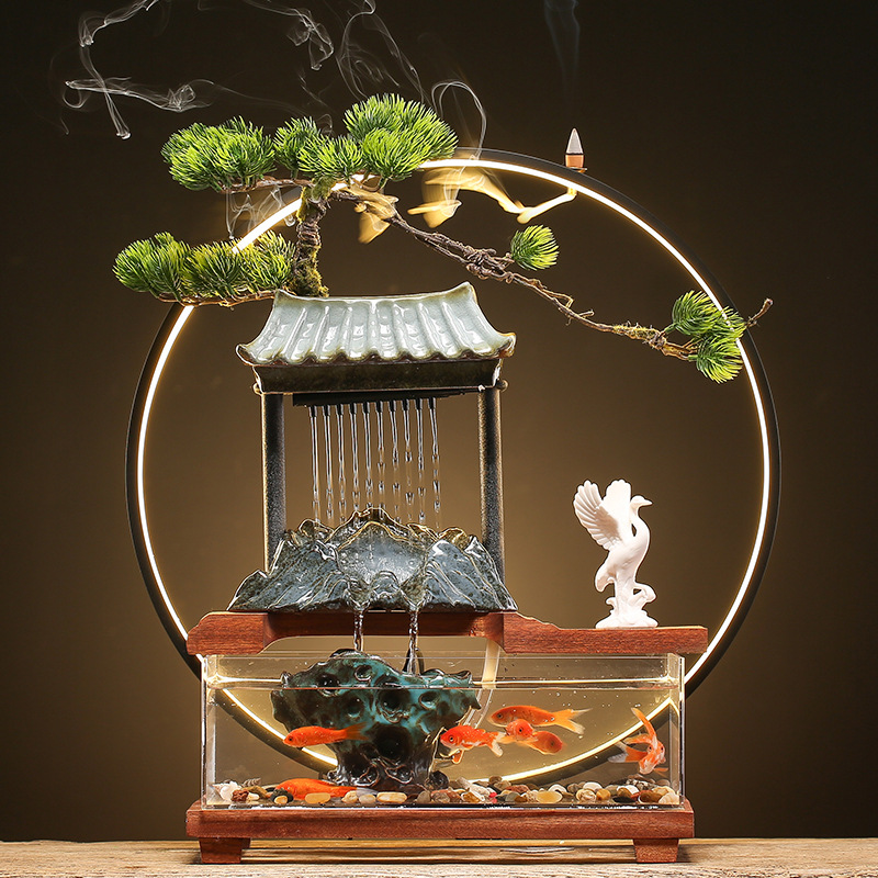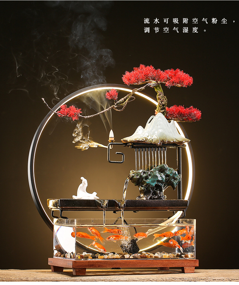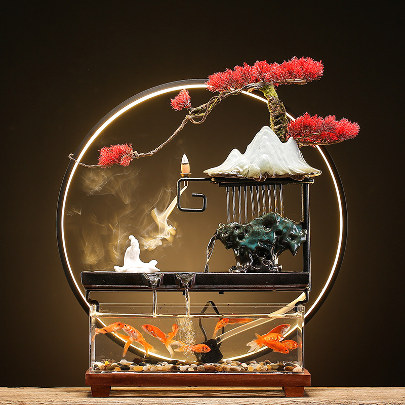 새로운 중국 선 순환 물 장식 분수 어항 비 커튼 램프 원형 창조적 인 홈 오피스 데스크탑 풍경