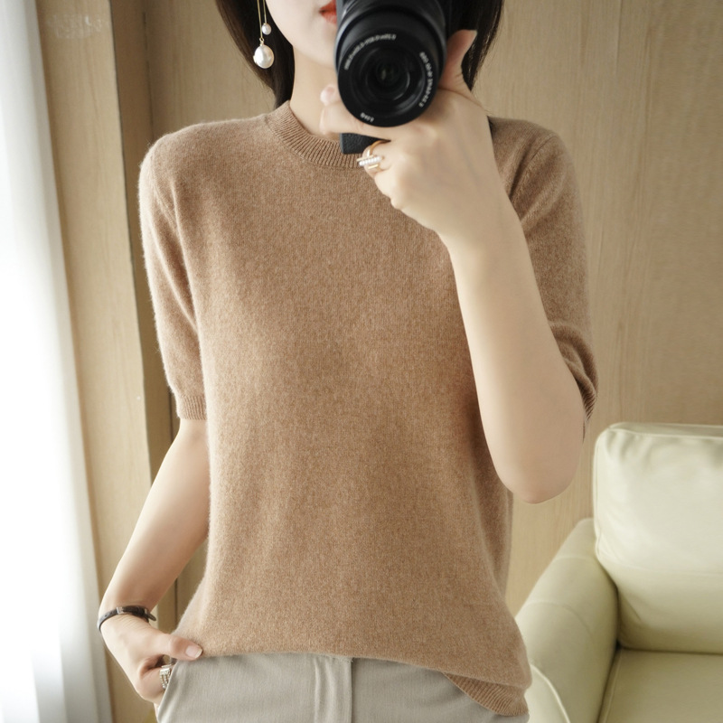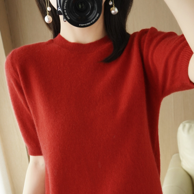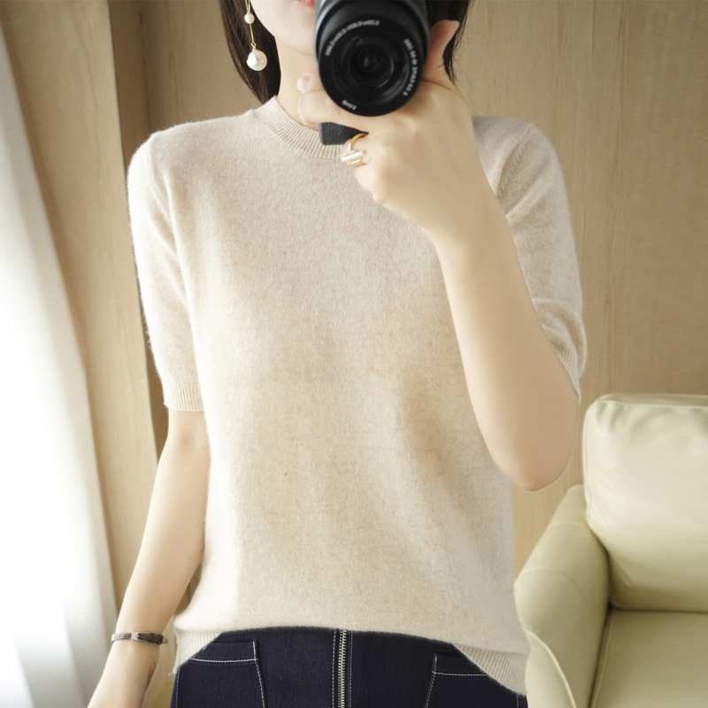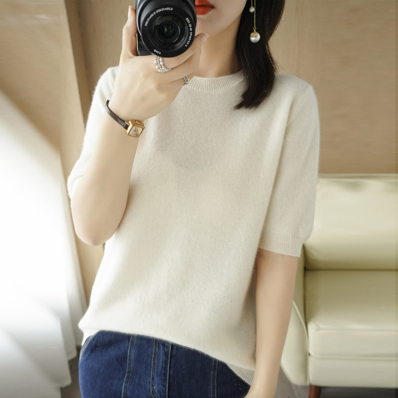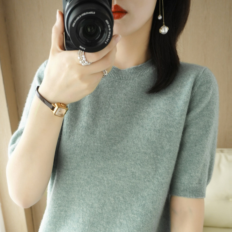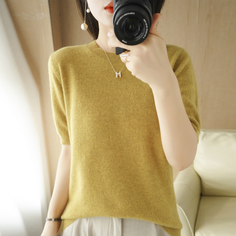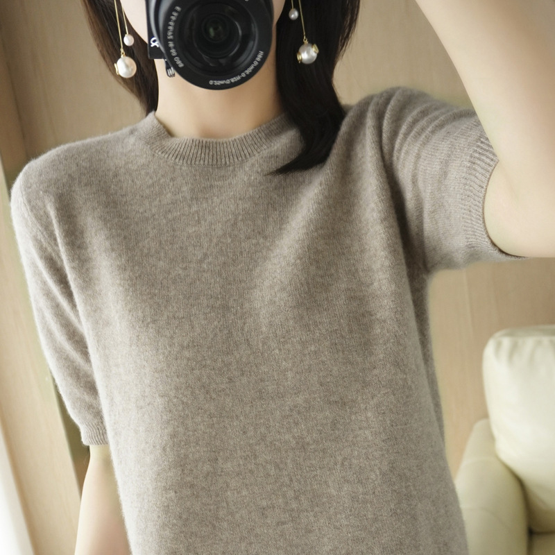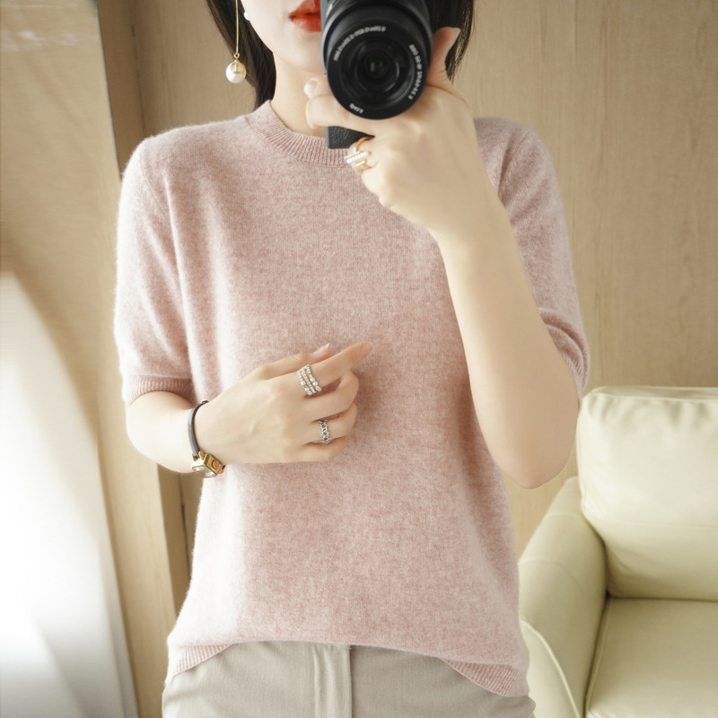 봄과 여름 2023 새로운 라운드 넥 니트 반팔 여성 캐주얼 풀오버 얇은 느슨한 반팔 티셔츠 탑