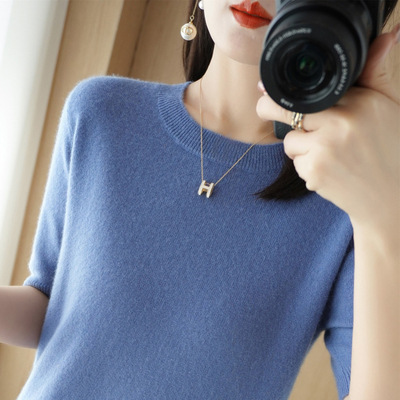 봄과 여름 2023 새로운 라운드 넥 니트 반팔 여성 캐주얼 풀오버 얇은 느슨한 반팔 티셔츠 탑스토어 가기