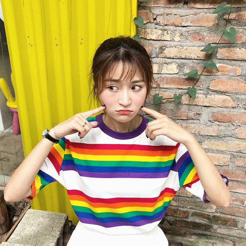 반팔 티셔츠 여성용 2022 여름 레인보우 스트라이프 티셔츠 한국식 학생 느슨한 바깥 긴 반팔 트렌디 탑스토어 가기