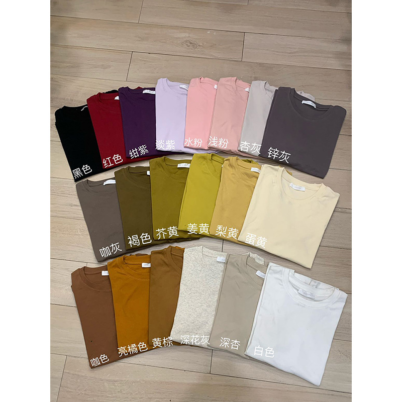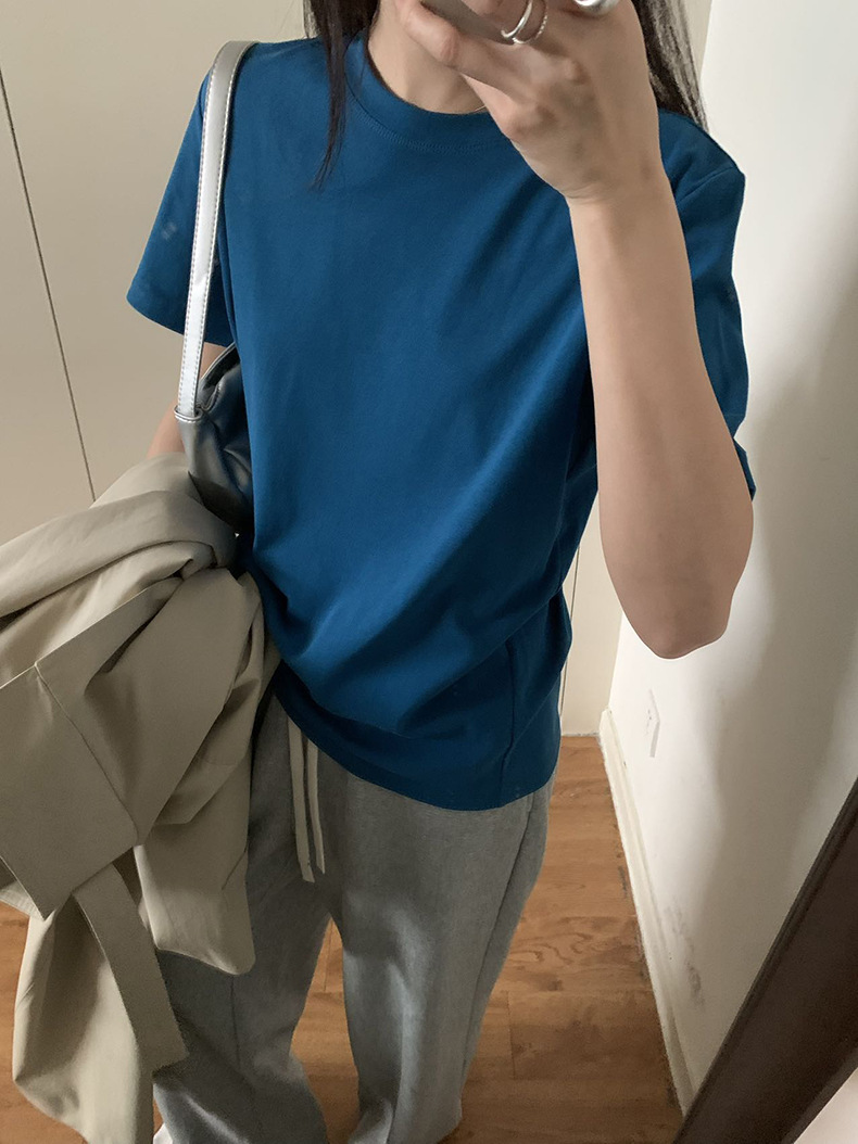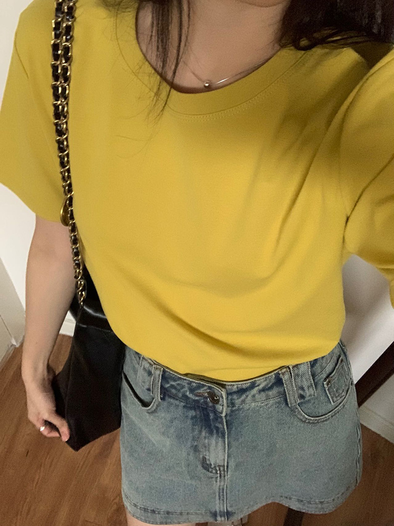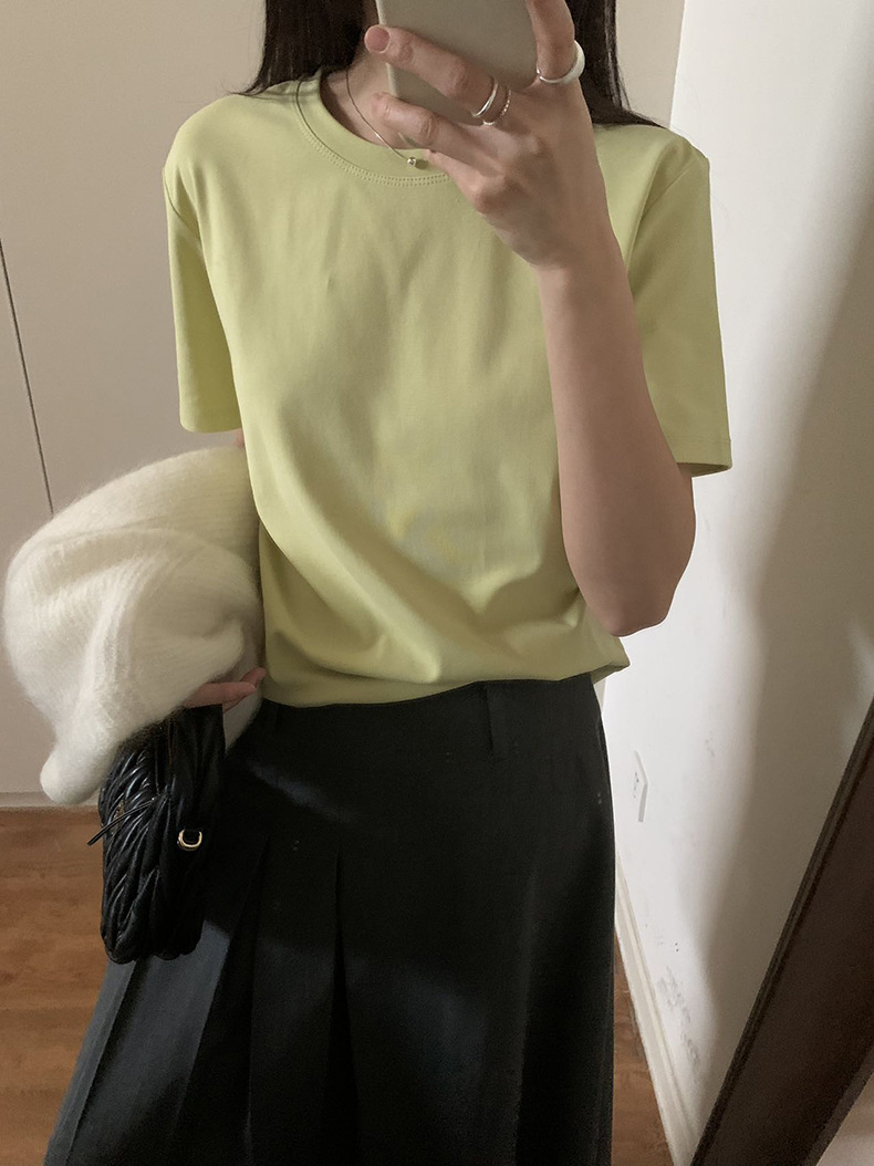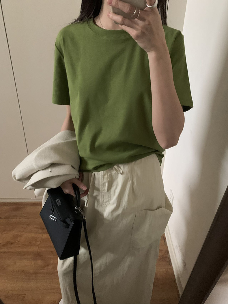[48 색상 옵션] 봄과 여름 새로운 라운드 넥 짧은 소매 티셔츠 여성용 느슨한 면화 풀오버 단색 간단한 다용도 탑스토어 가기