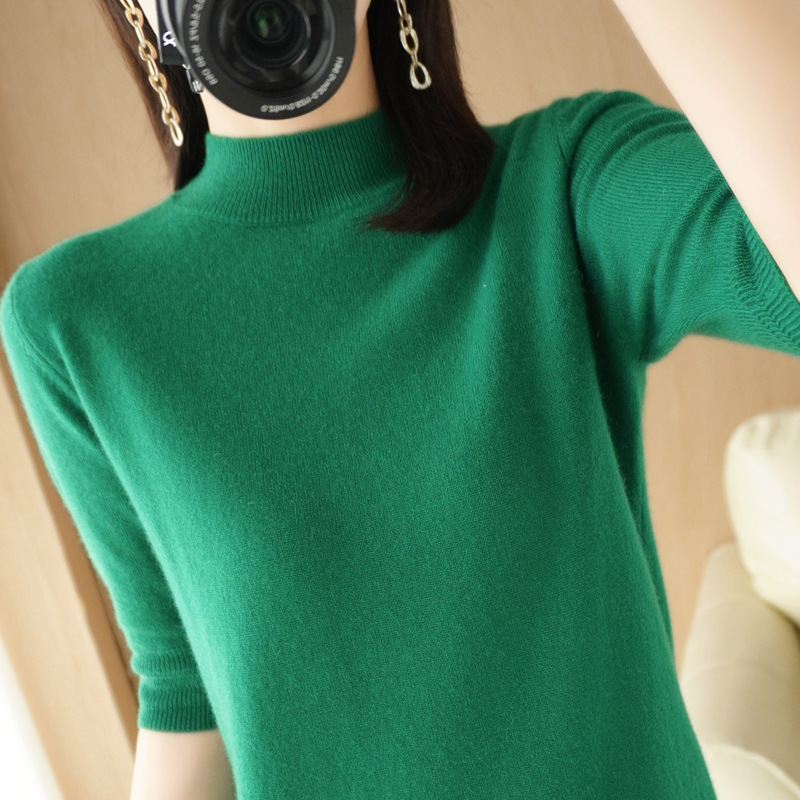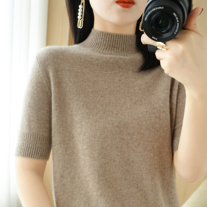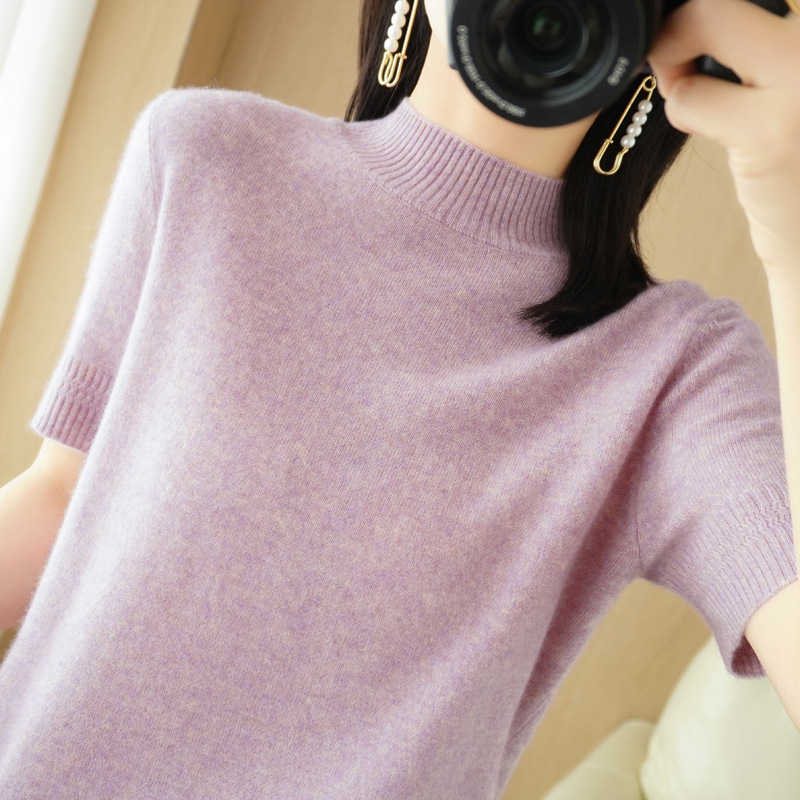 울 혼방 2026 봄 여성용 루즈핏 하프넥 숏 풀오버 솔리드 컬러 반팔 니트 티셔츠