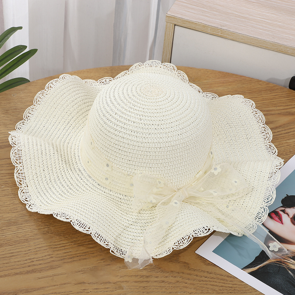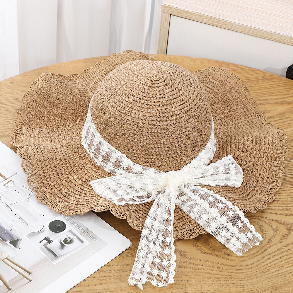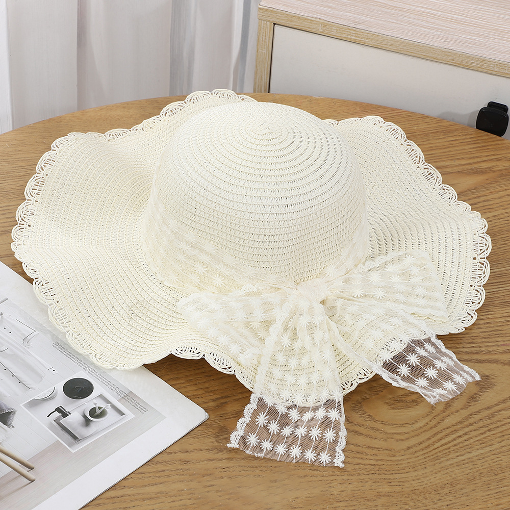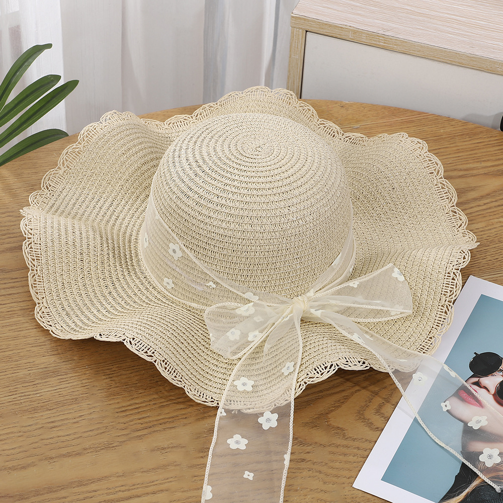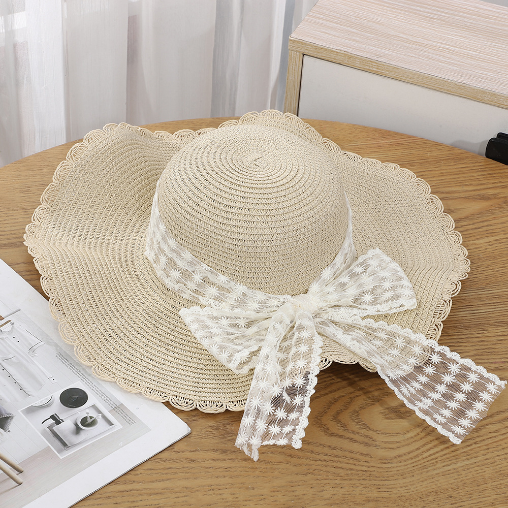 • 물결 레이스 리본 밀짚모자 - 베이지