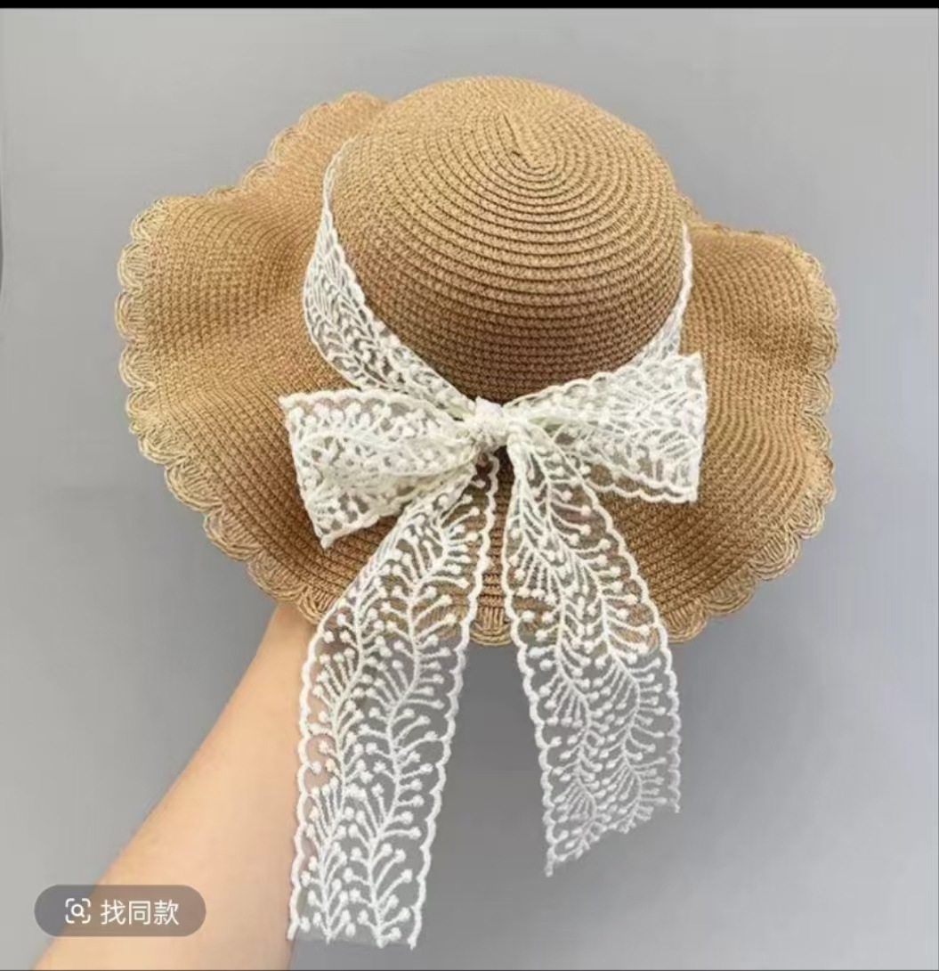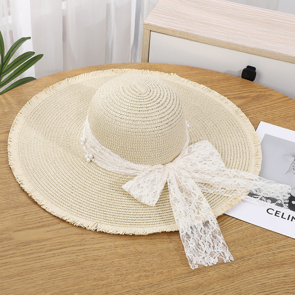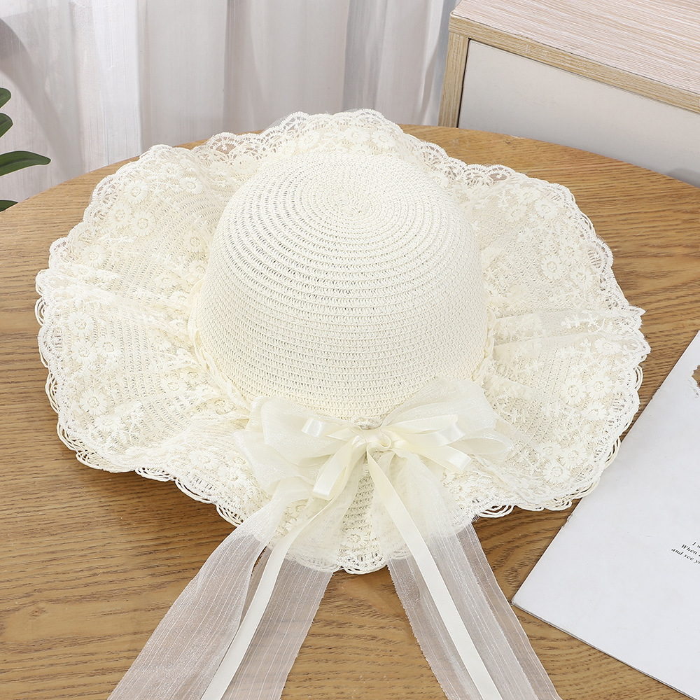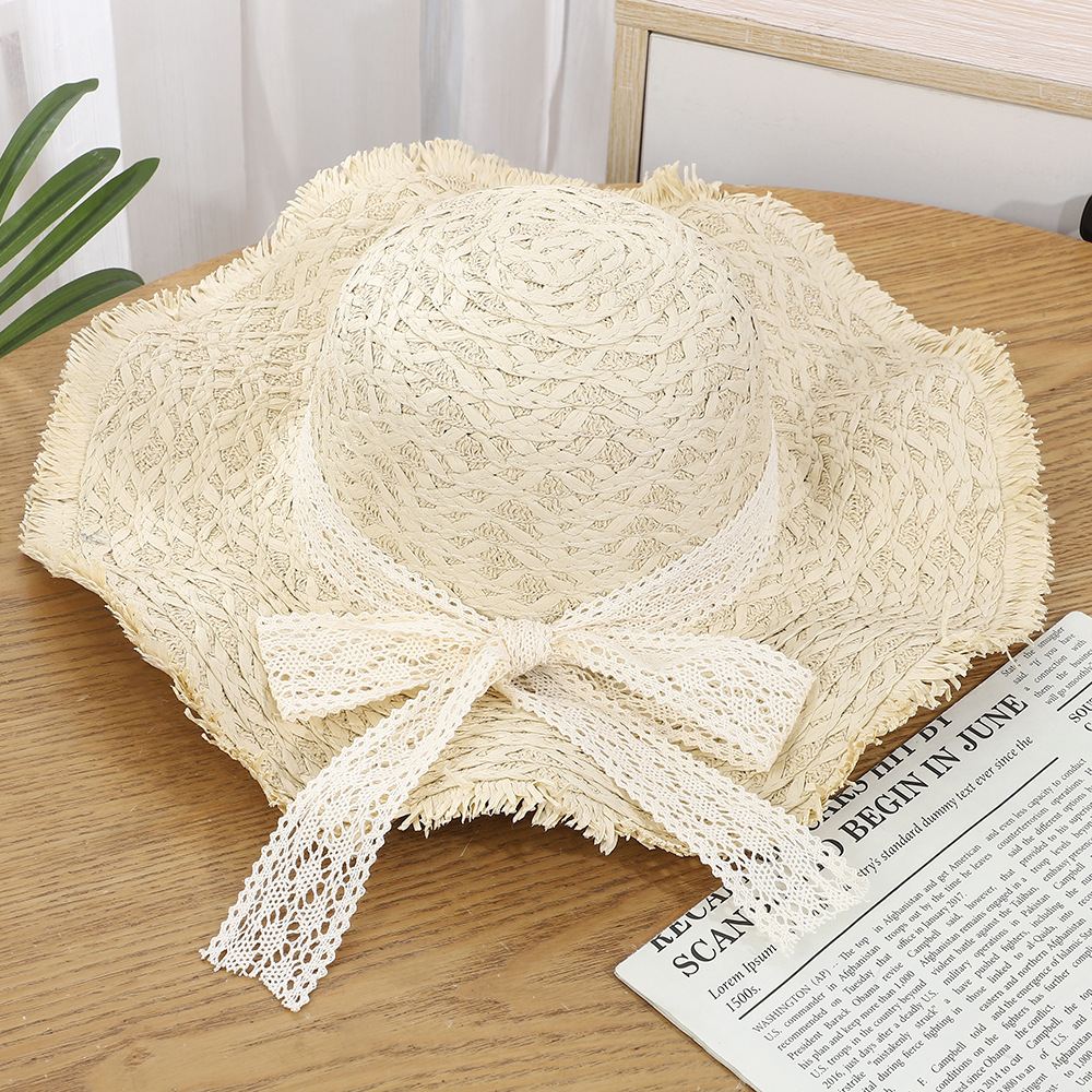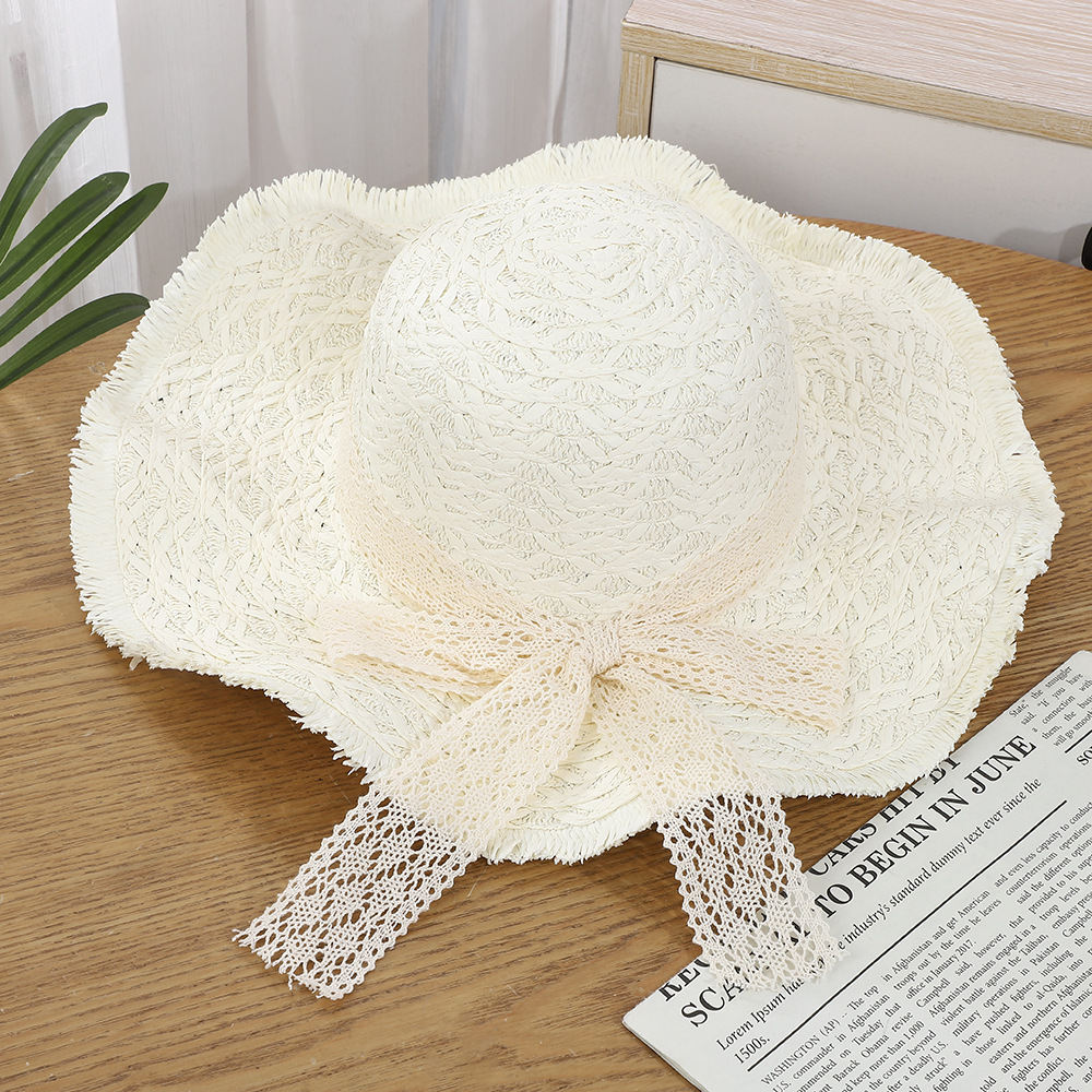 • 물결 레이스 리본 밀짚모자 - 베이지