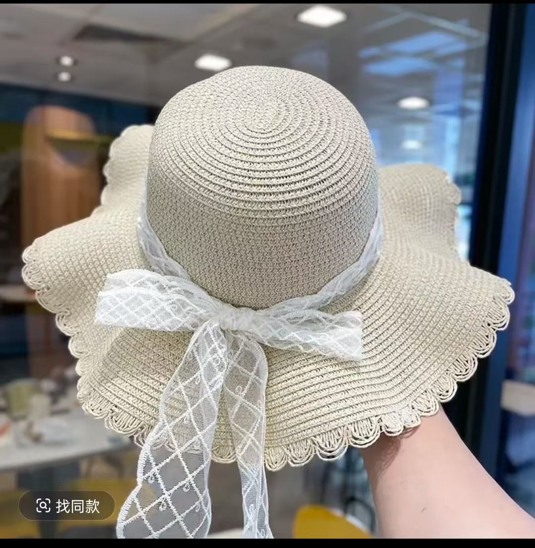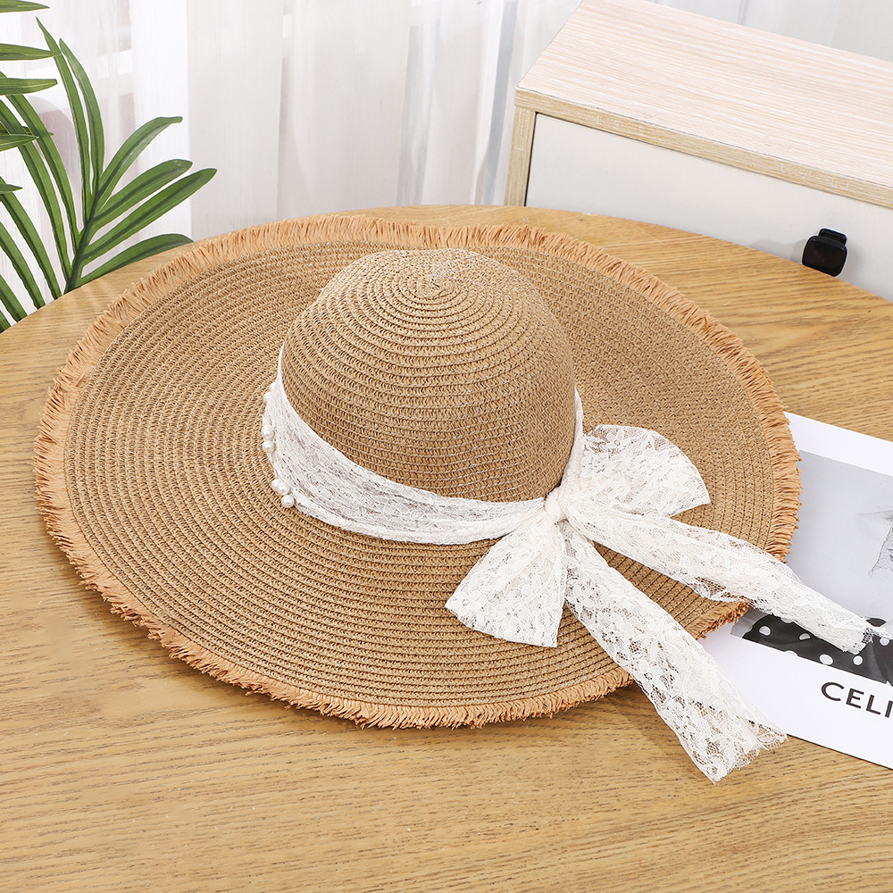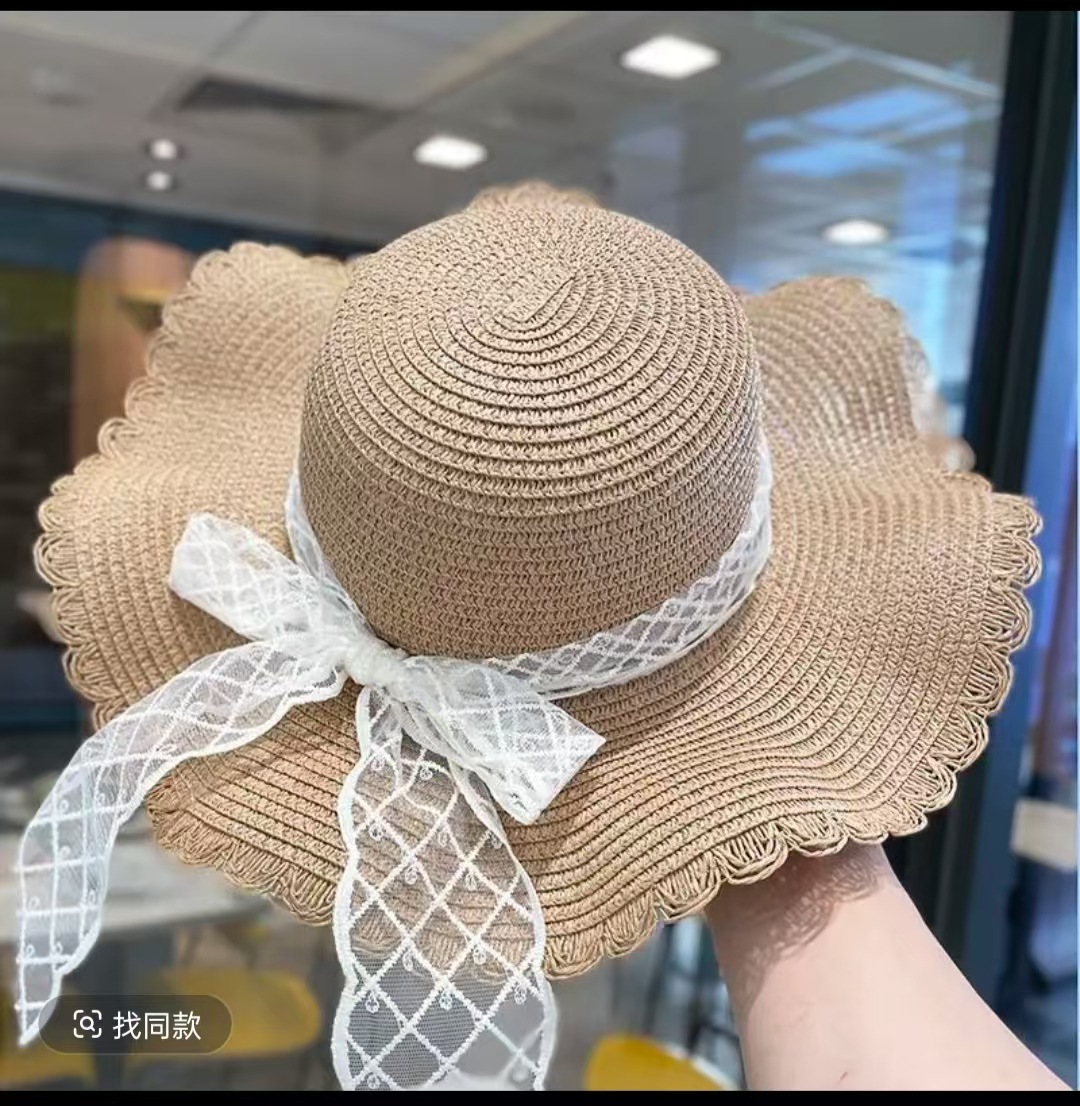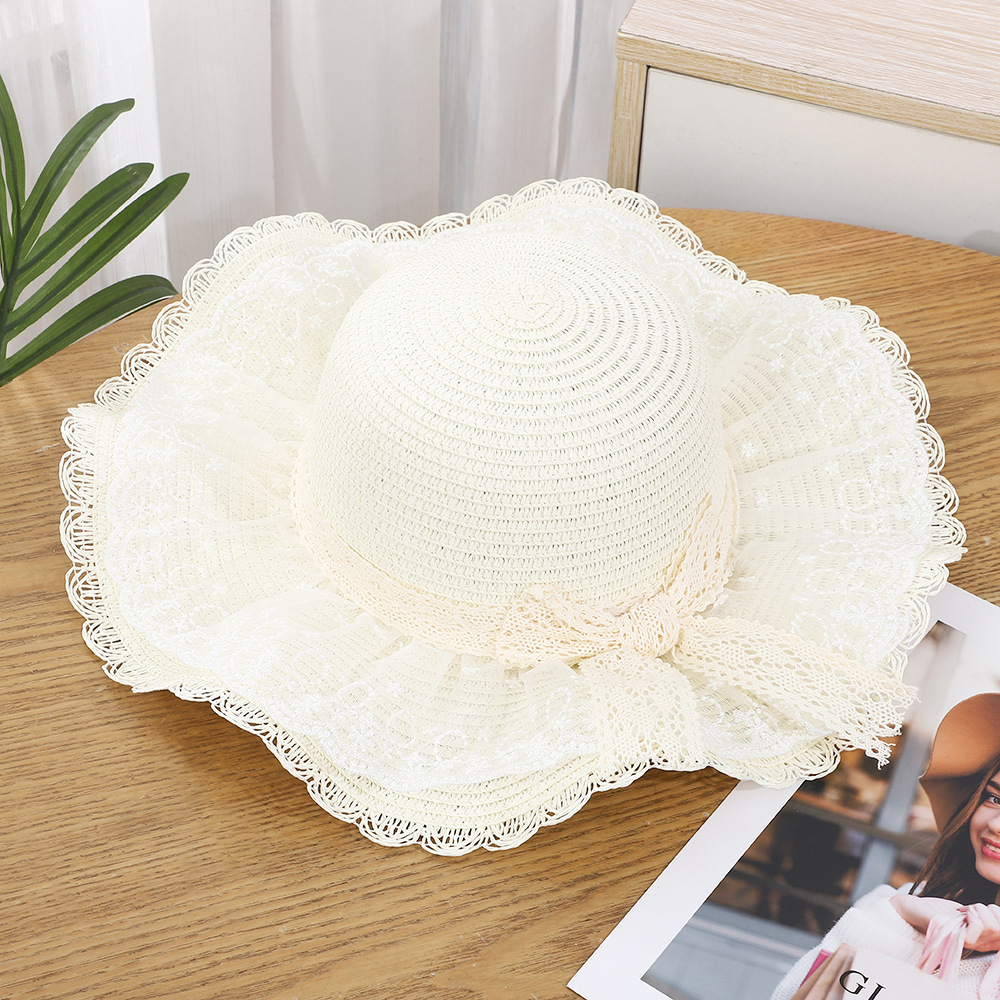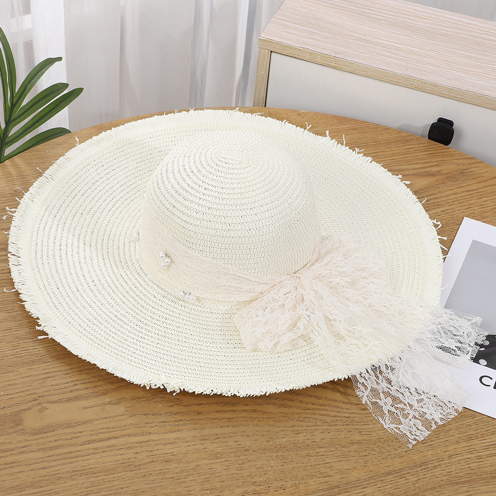 • 물결 레이스 리본 밀짚모자 - 베이지