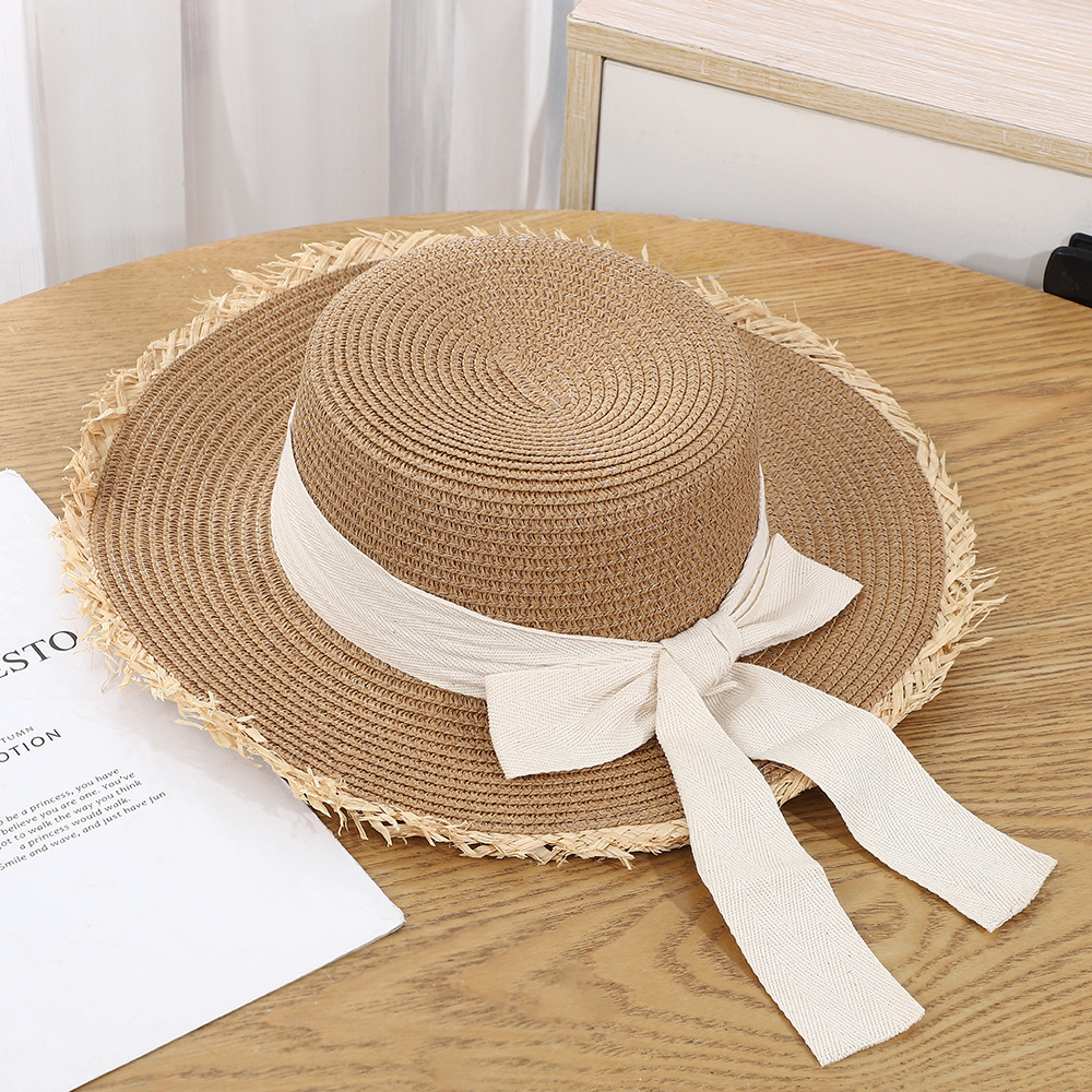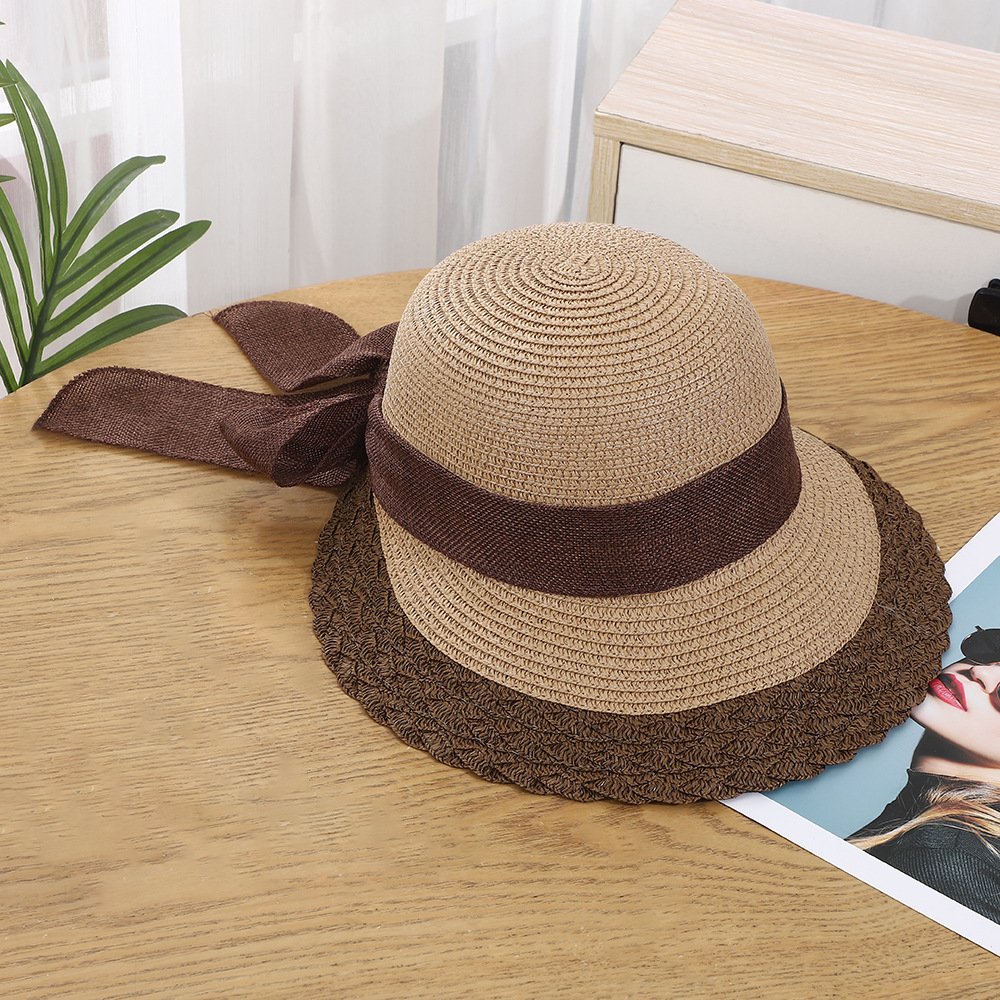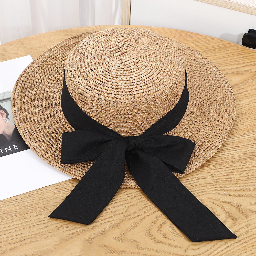 • 평챙 리본 밀짚모자 - 커피색