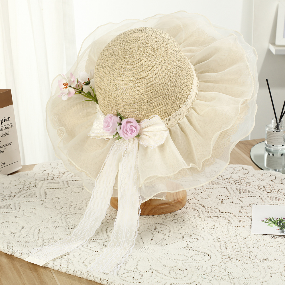 • 레이스 리본 장미 꽃 밀짚모자 - 베이지