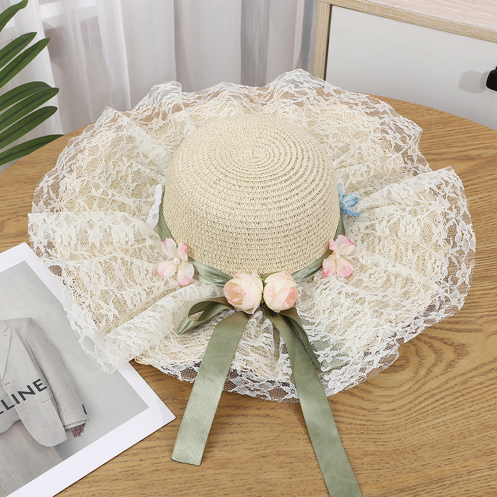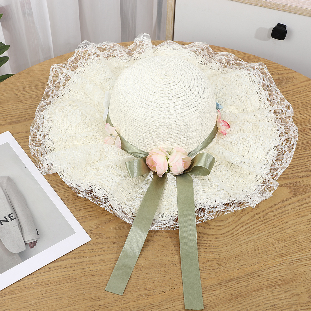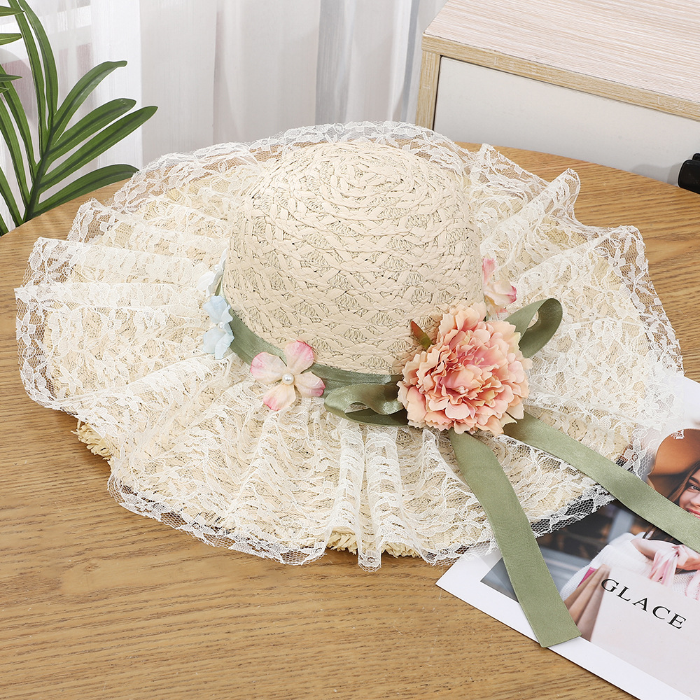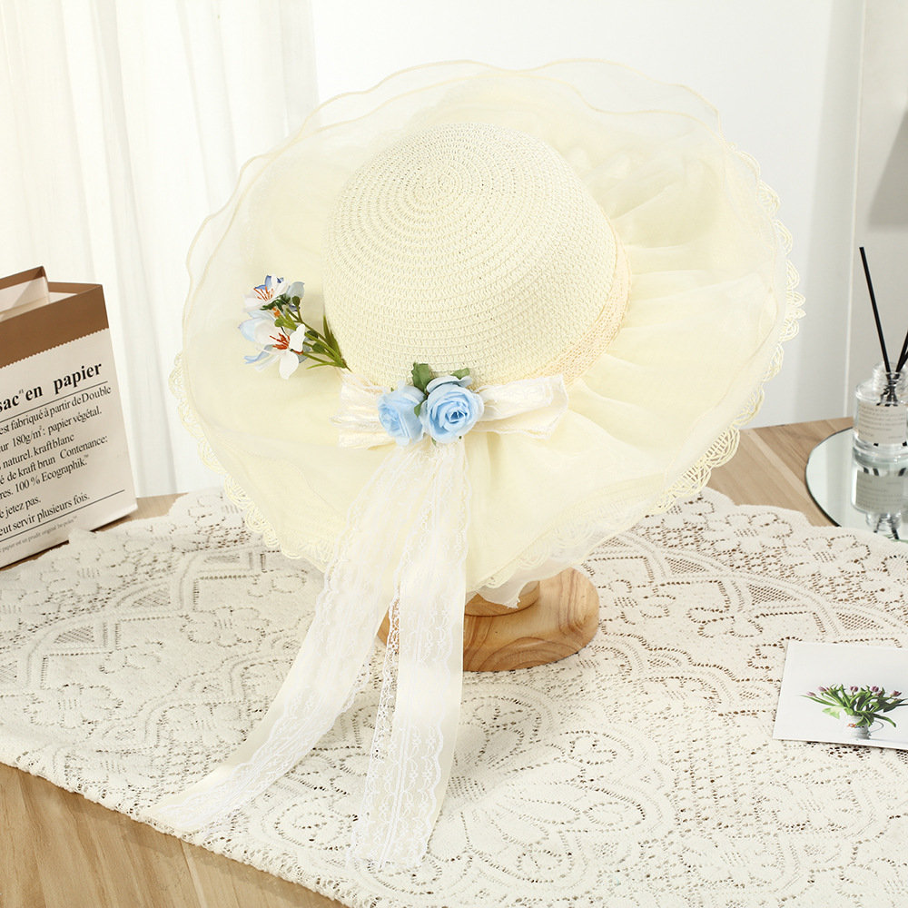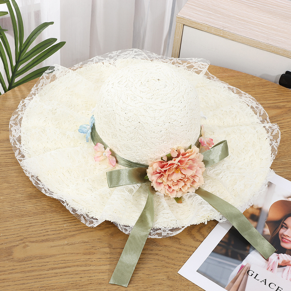 • 물결 레이스 플라워 리본 밀짚모자 - 베이지