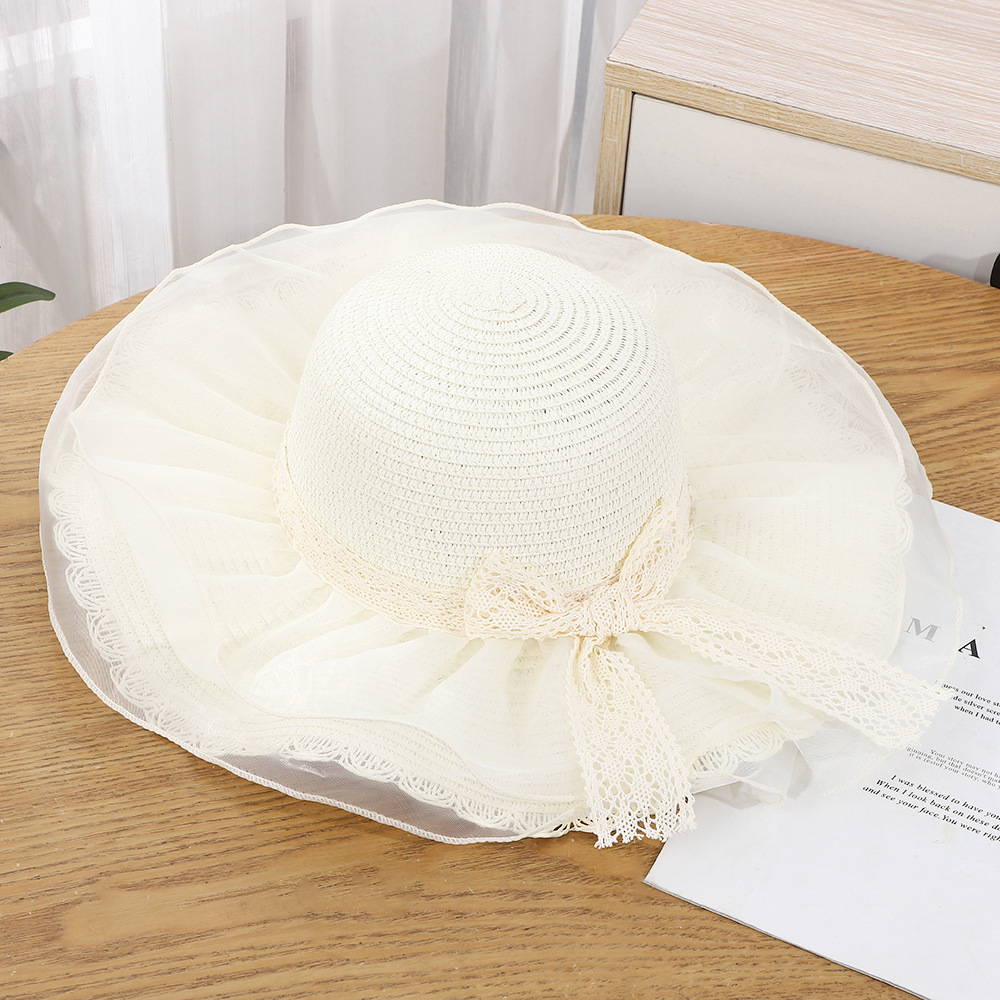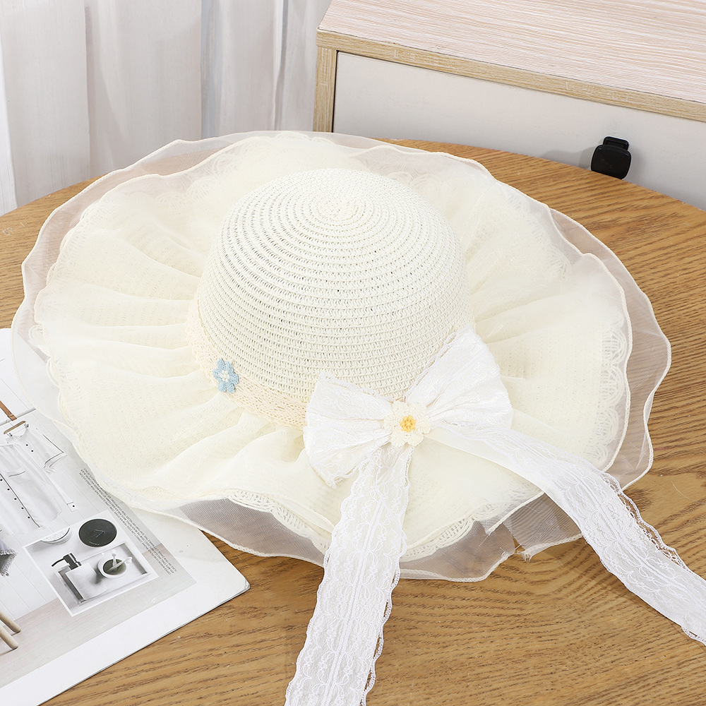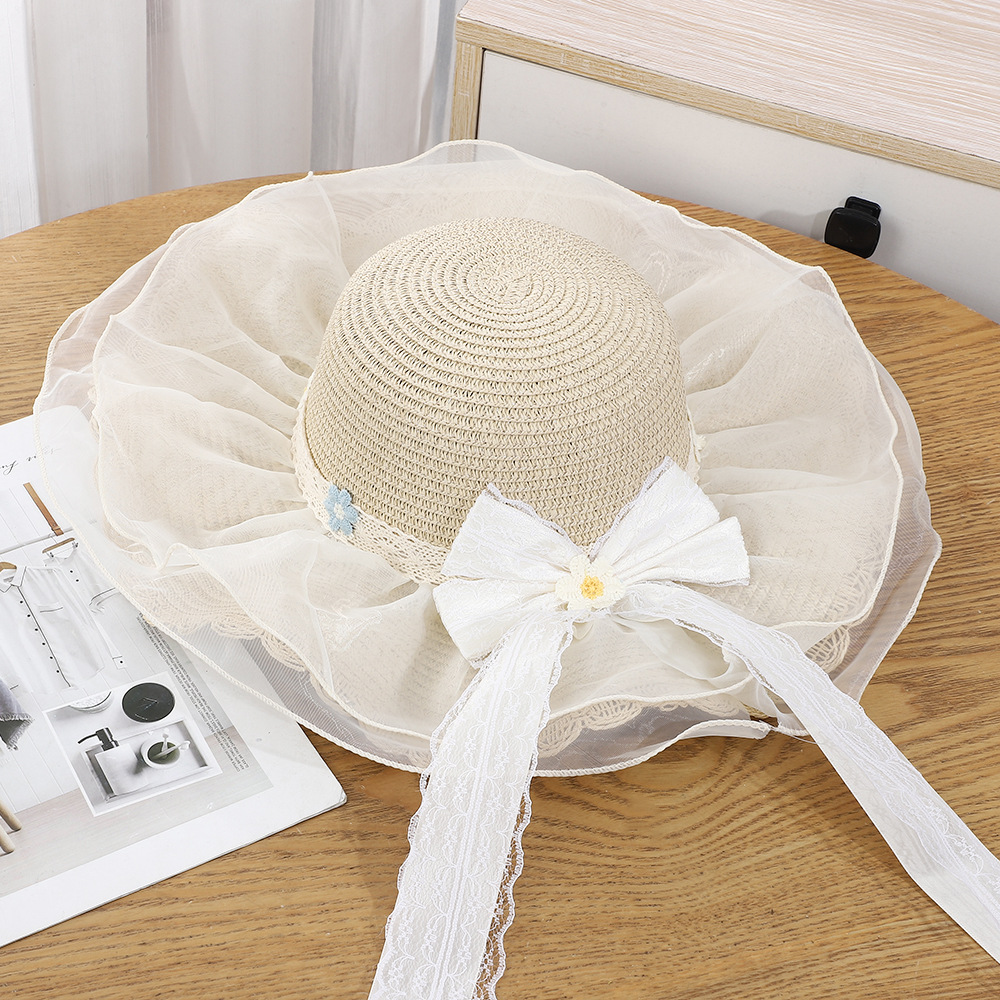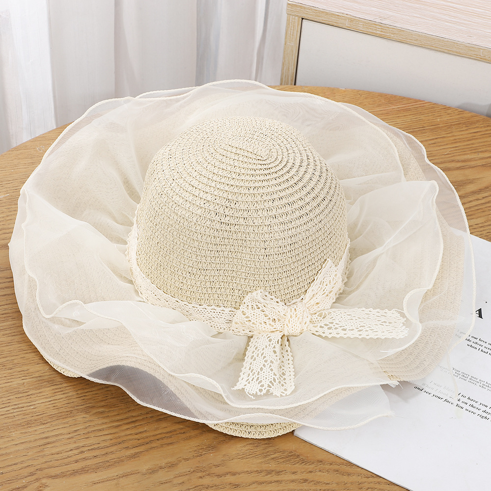 • 물결 레이스 이중 거즈 리본 밀짚모자 - 베이지