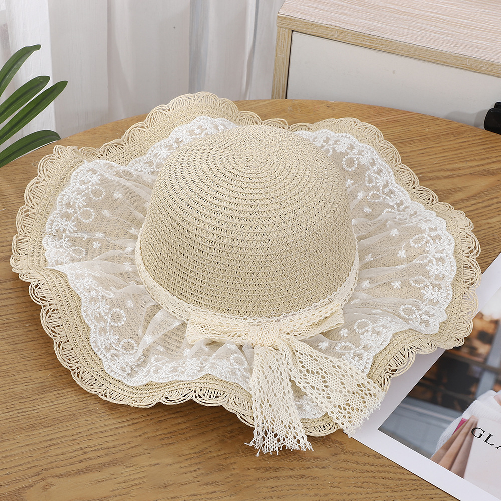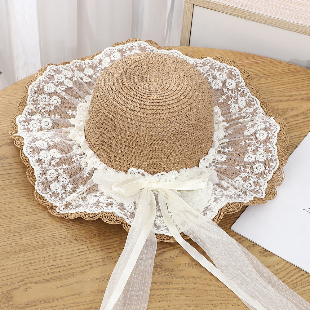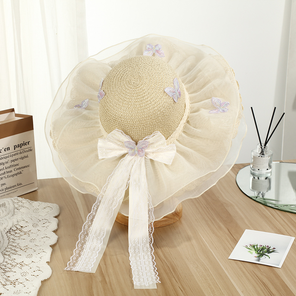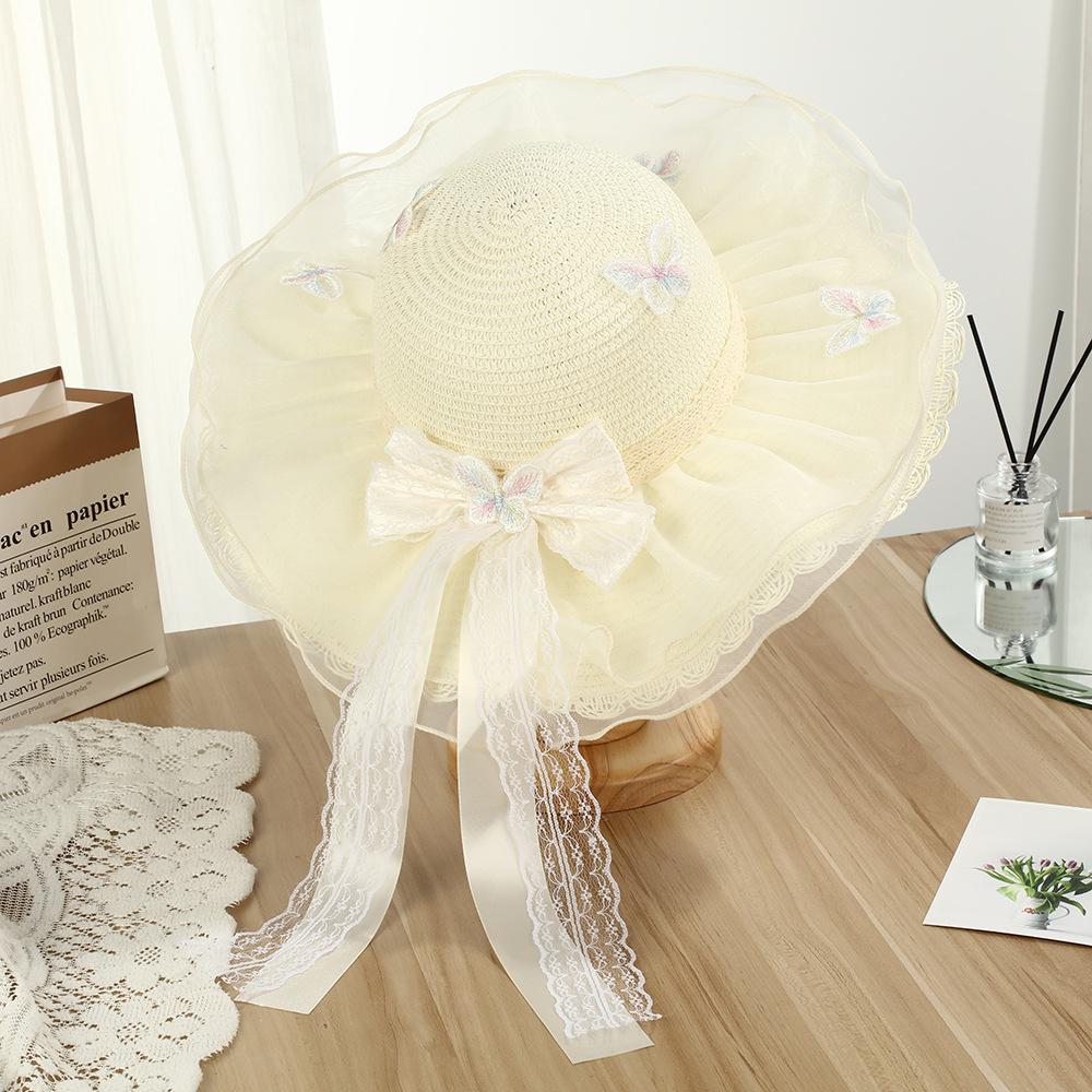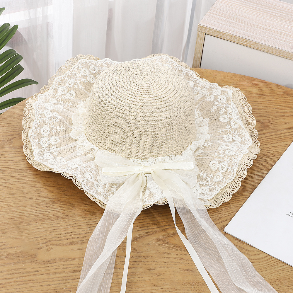 • 물결 레이스 이중 거즈 리본 밀짚모자 - 베이지