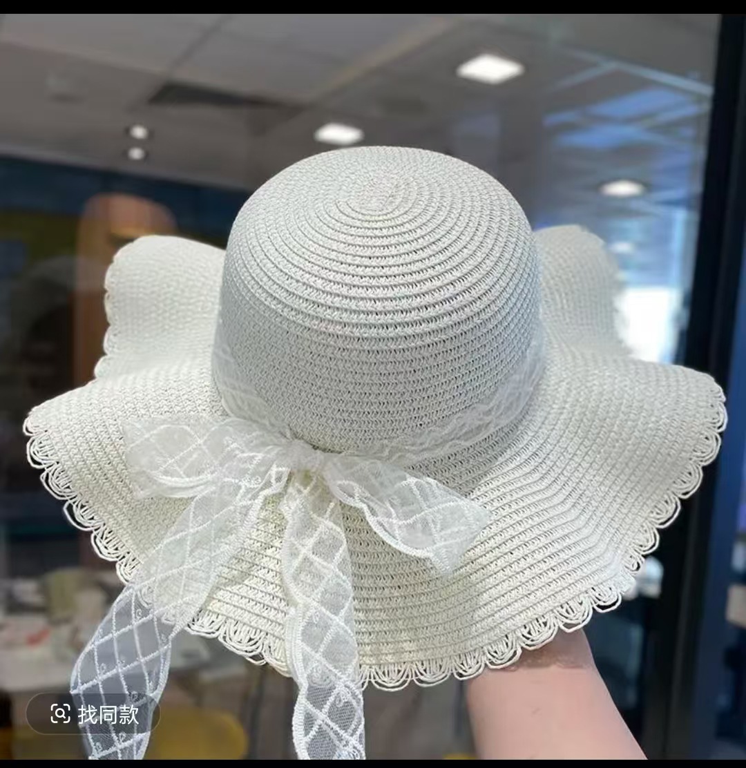 • 물결 레이스 리본 밀짚모자 - 화이트