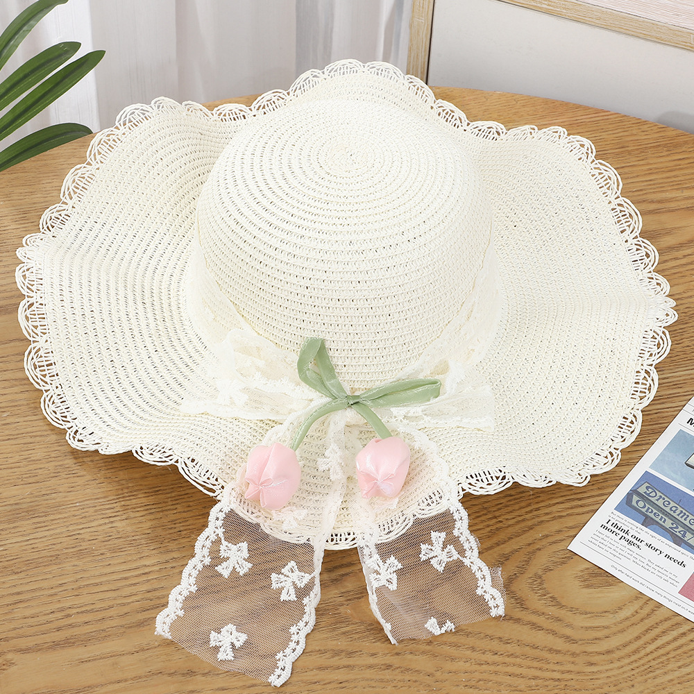 • 물결 레이스 플라워 리본 밀짚모자 - 화이트