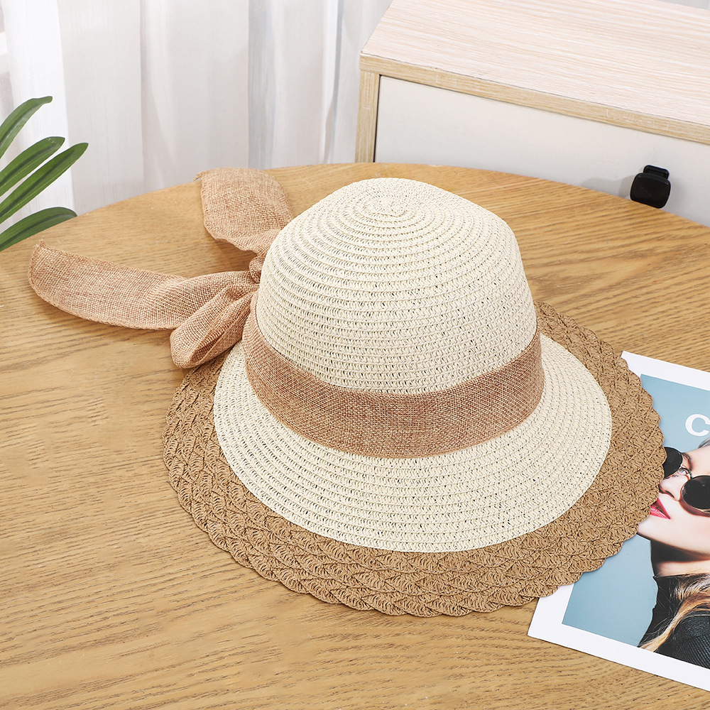 • 로우 엣지 리본 밀짚모자 - 커피색과 흰색 벨트