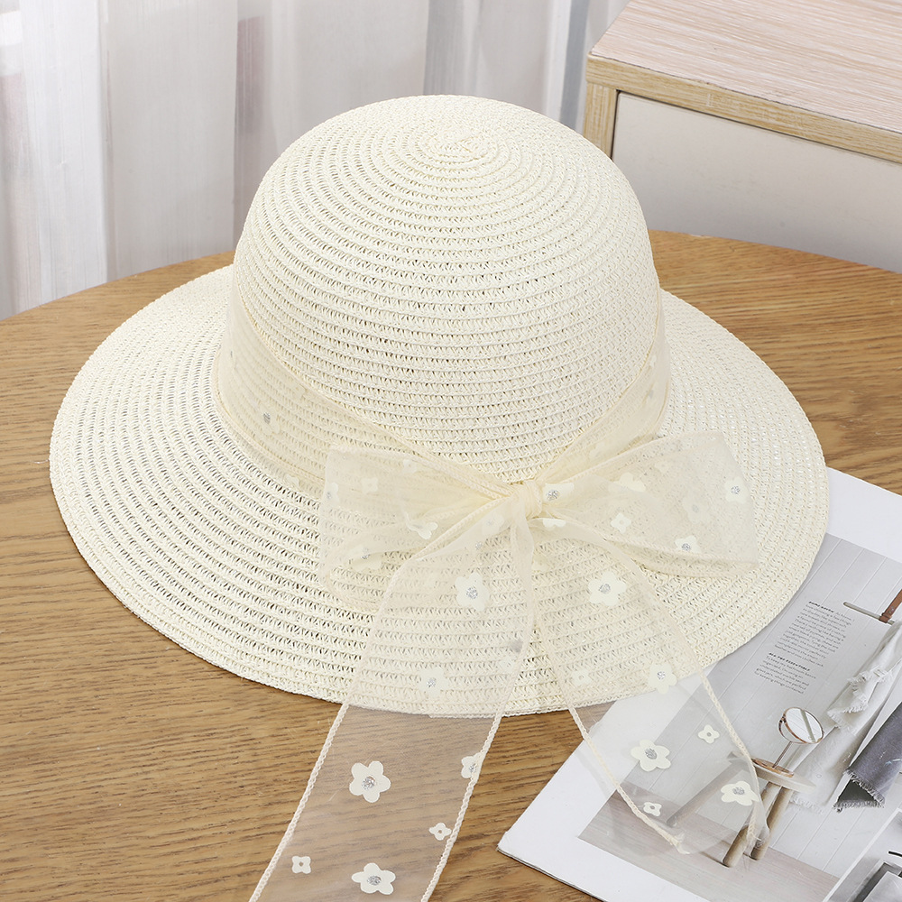 • 레이스 트리밍 플라워 리본 보우 밀짚모자 (베이지)