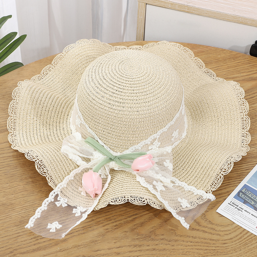• 물결 튤립 망사 리본 밀짚모자 - 베이지