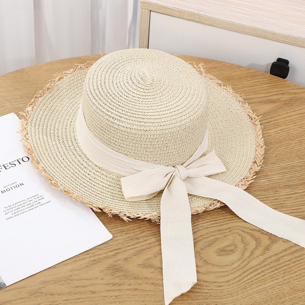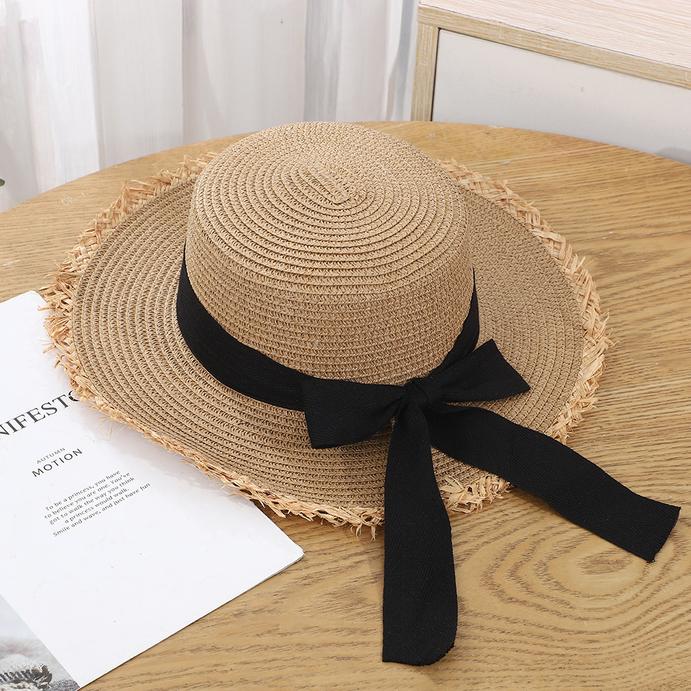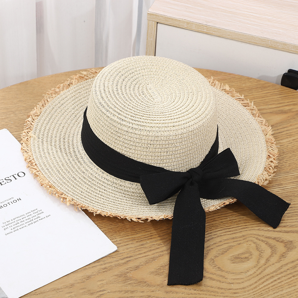 • 로우 엣지 리본 밀짚모자 - 베이지 블랙 벨트