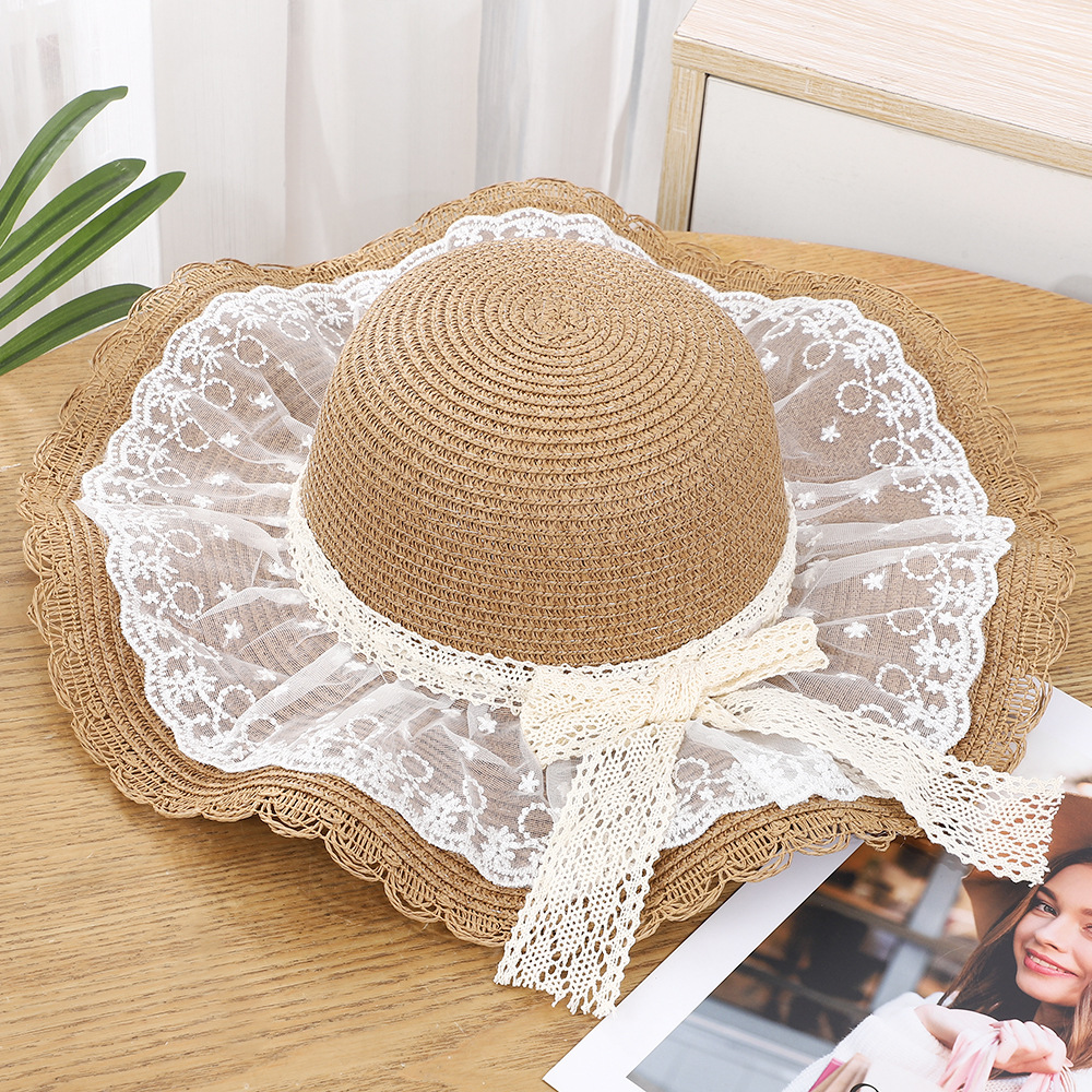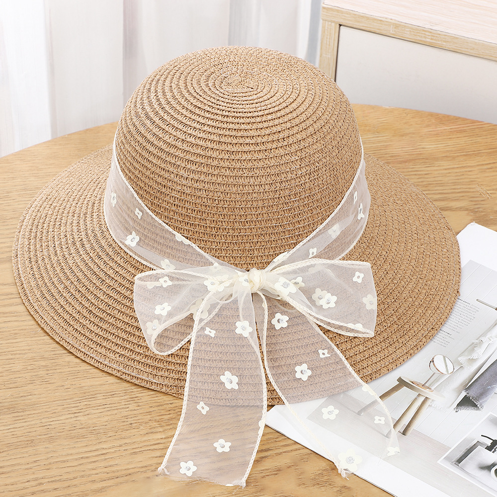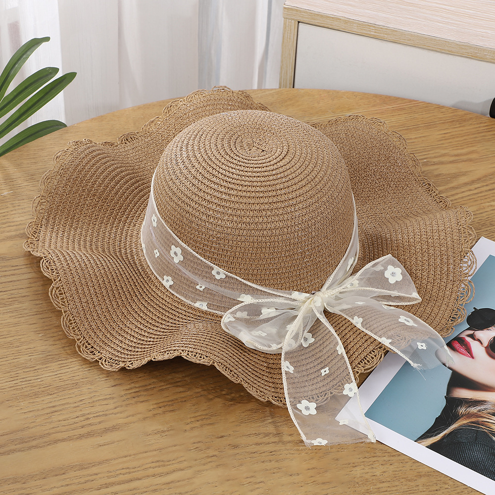 • 물결 레이스 플라워 리본 밀짚모자 - 브라운