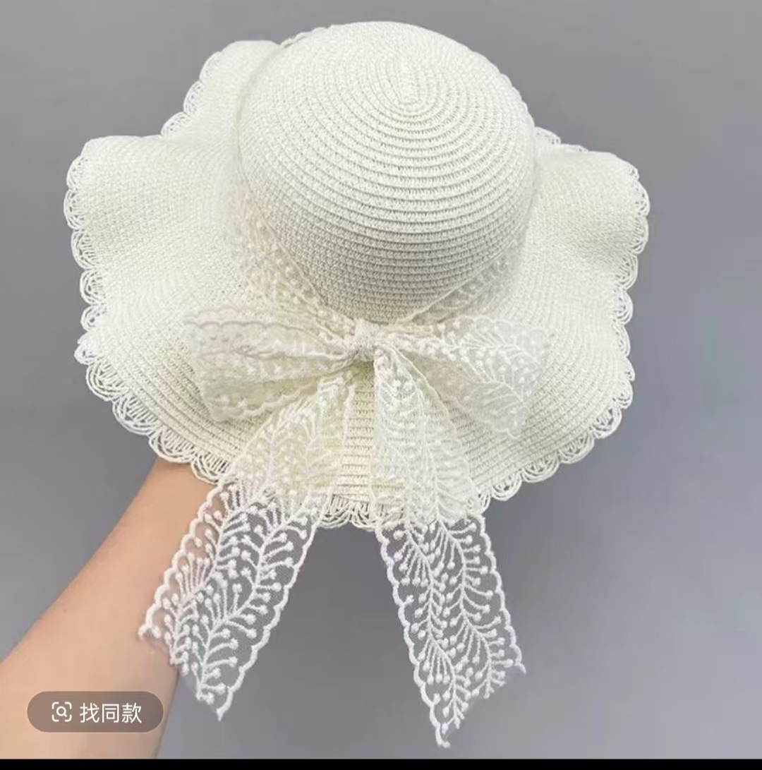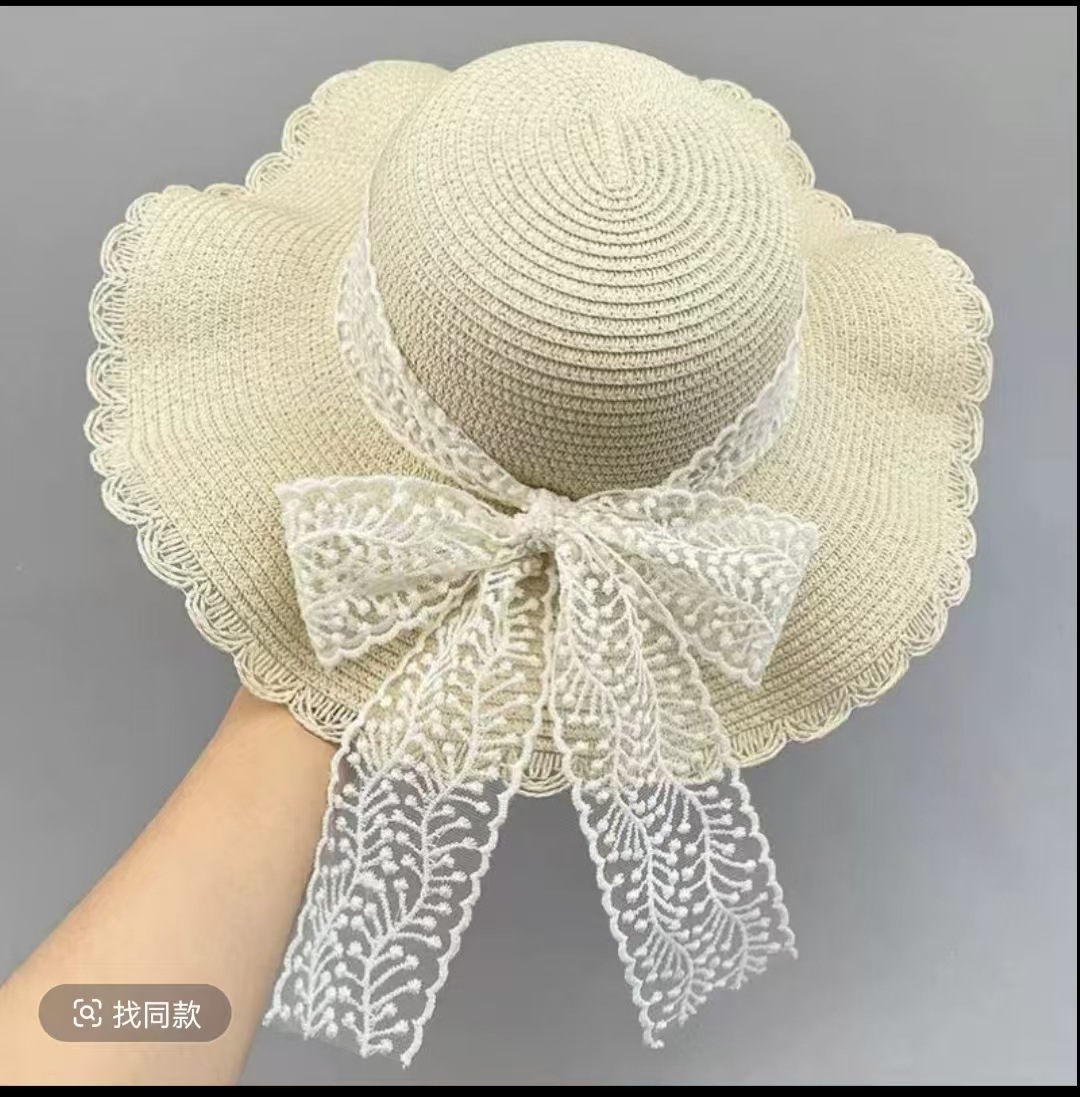 • 물결 레이스 별무늬 리본 밀짚모자 - 베이지